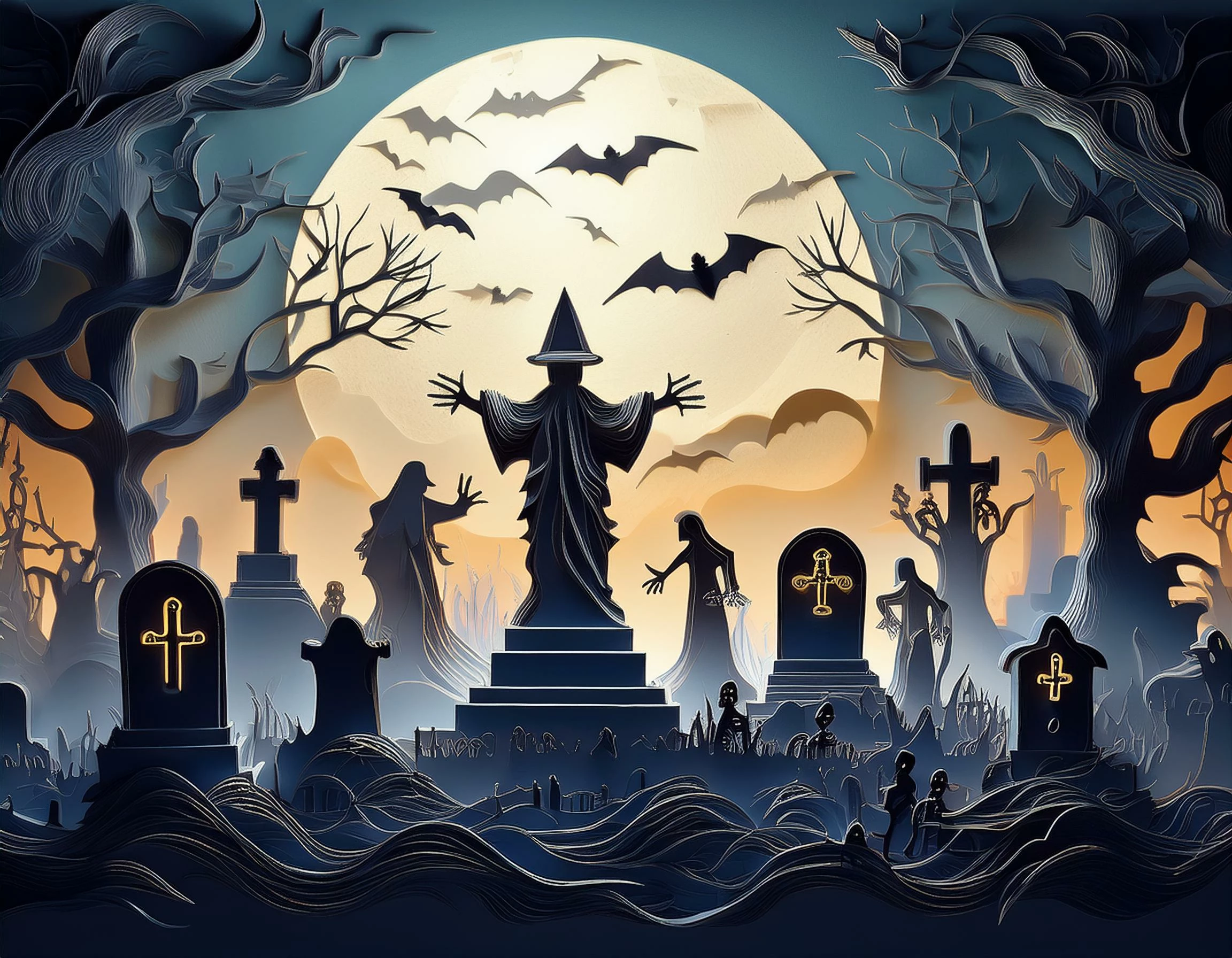 Prompt: spooky graveyard surrounded by trees; ghostly bodies floating above each tombstone, include: zombies, black cats, bats, witches, ghouls, and an eerie moon [Layered Paper]