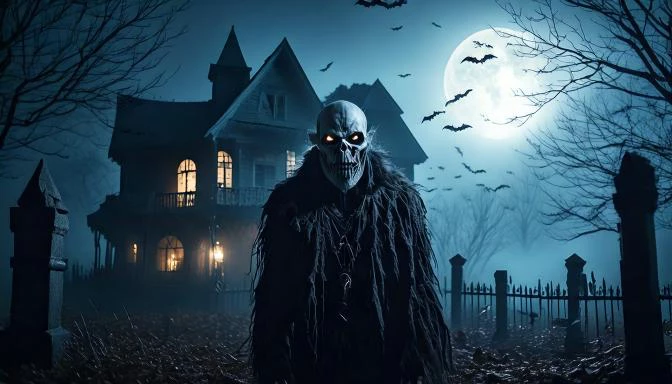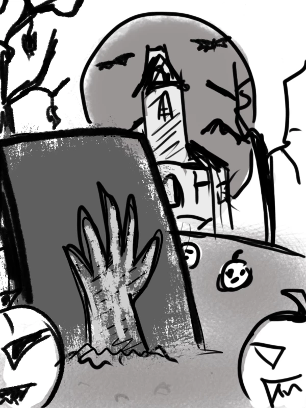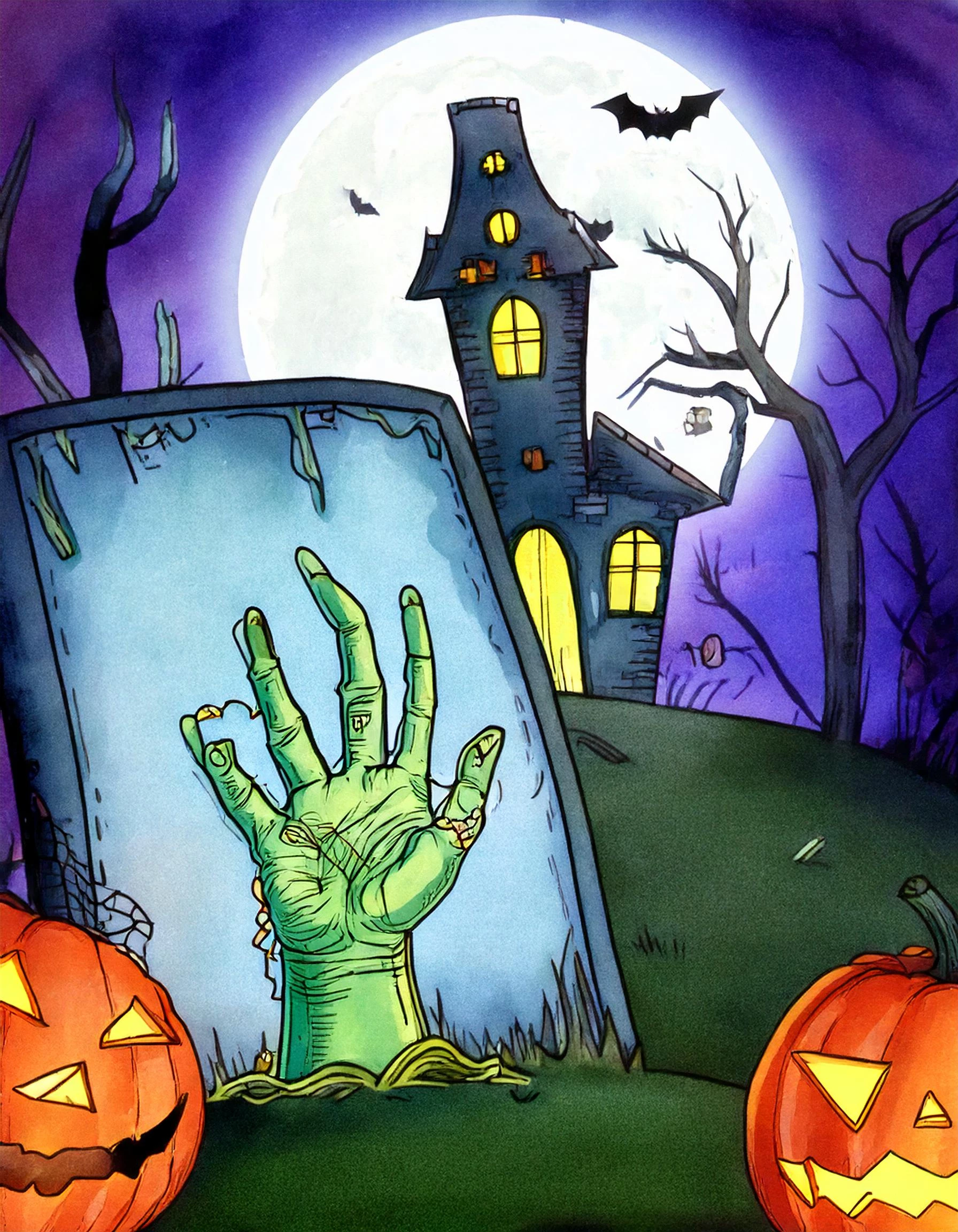 "Zombie Hand getting off the ground in front of a Tombstone. Background is a Spooky Halloween night scene featuring a haunted houseon a hill with broken windows, eerie glowing lights inside, and overgrown vines crawling up its walls.A large, full moon casting a silver glow over the entire scene. Dead, twisted trees surround the house, their leafless branches stretching into the sky like skeletal arms. Add a lot of glowing jack o’lanterns at their feet. Bats are flying across the moon in an overall creepy atmosphere and a sense of impending doom. Dark shadows."