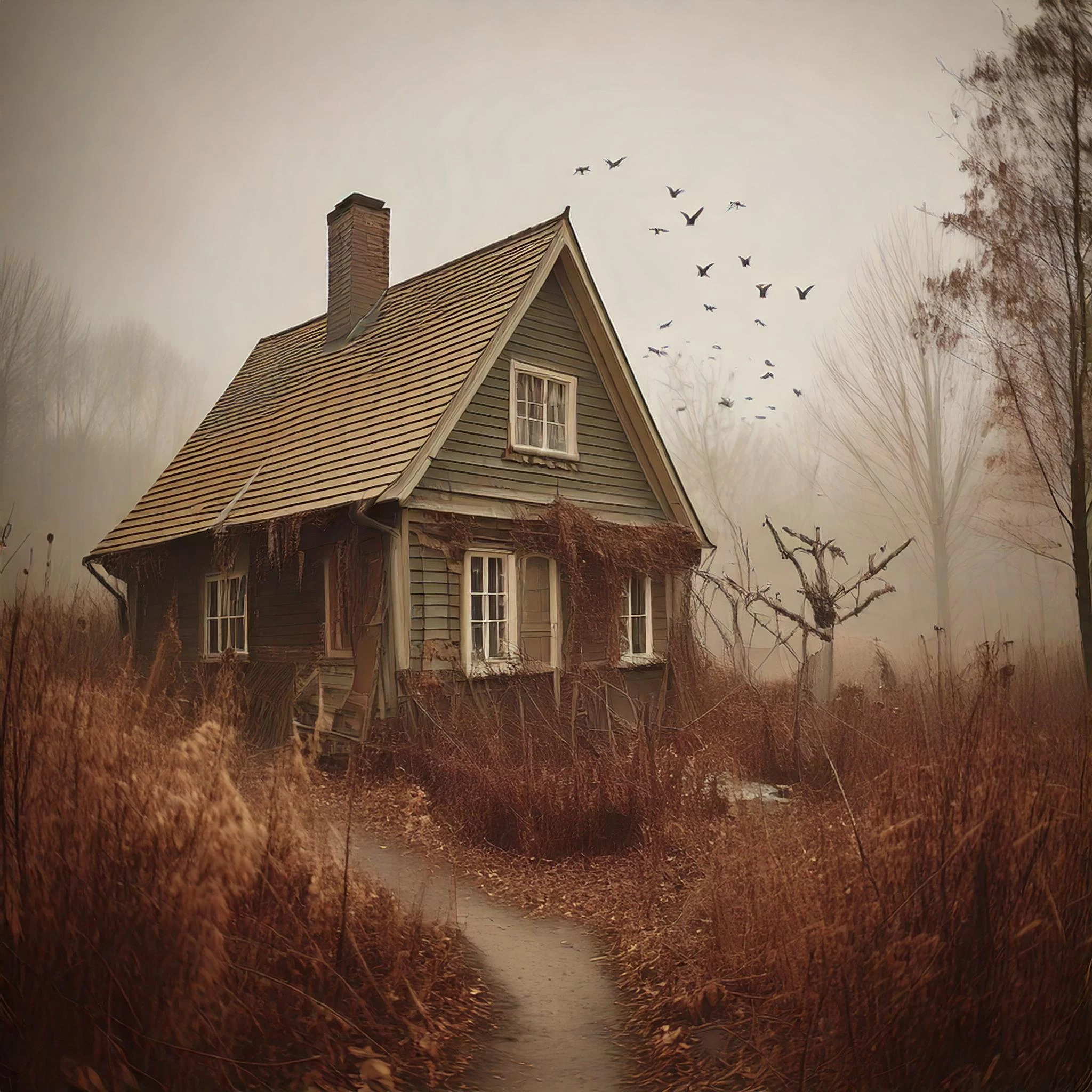 Prompt: a dark colored witch's cottage with a wild, autumn herb garden, crows, mist, dark forest