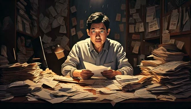 a man sitting on a desk so scared with lots of bills and due date payments in a haunting background