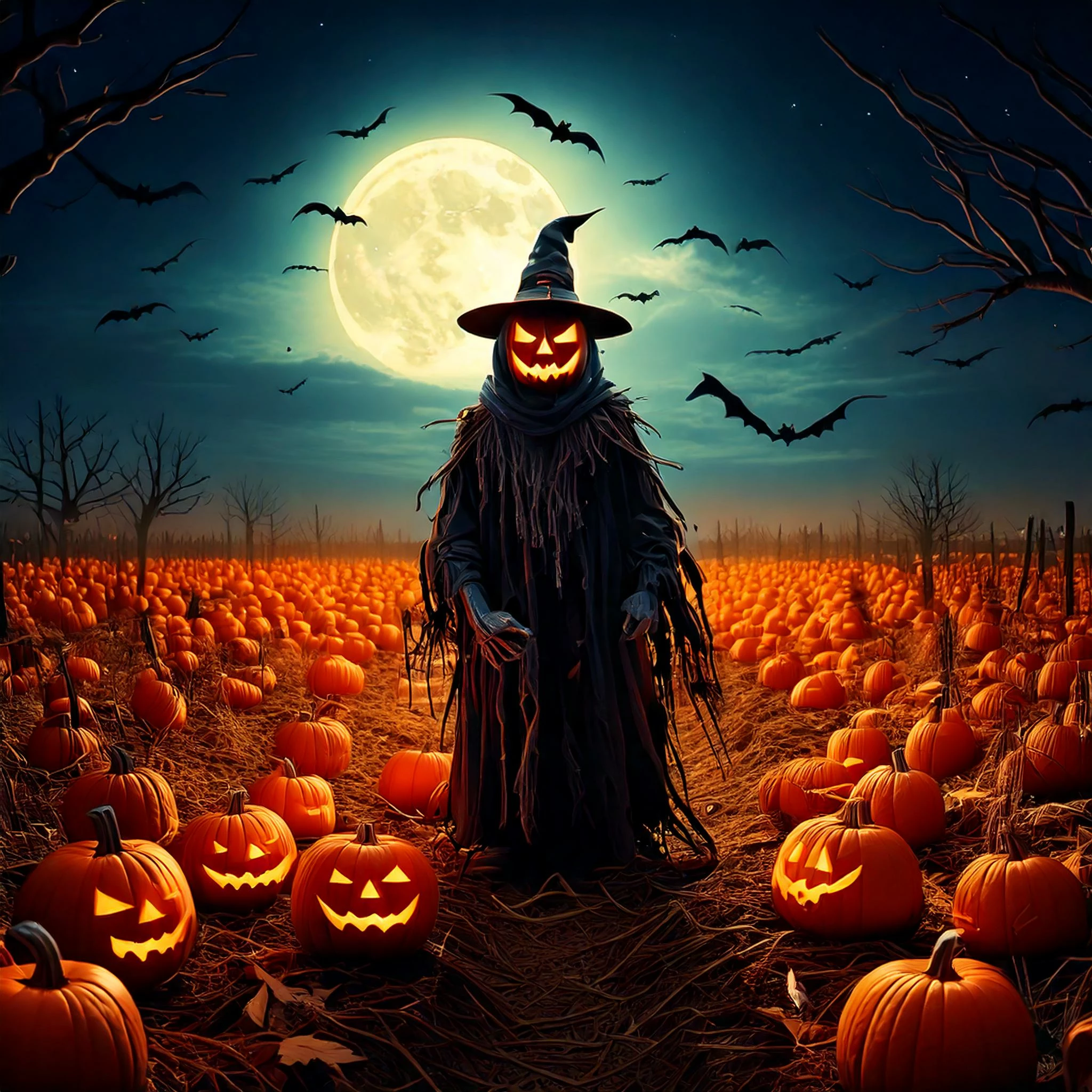 Prompt: full moon over a field of pumpkins, bats in the sky, and an ominous scare crow in the center.