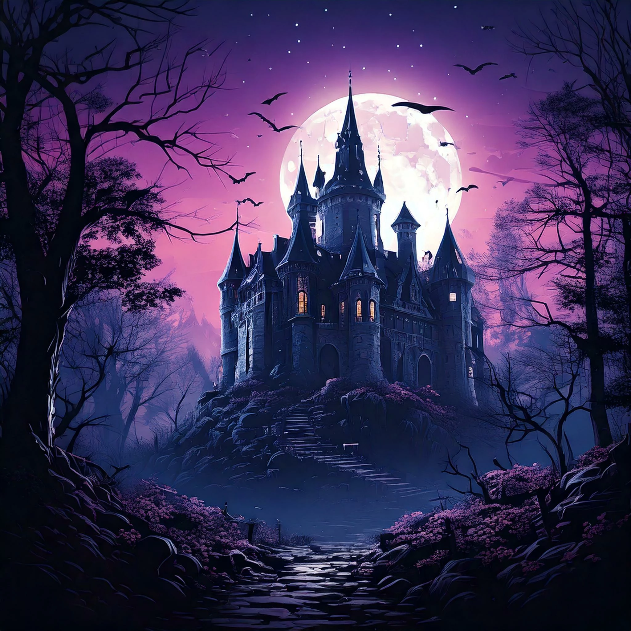 The prompt : Mystical and mysterious scene of a haunted castle in the heart of a forest, during a night of full moon, the colours are purplish, bats are flying around the towers of the castle.