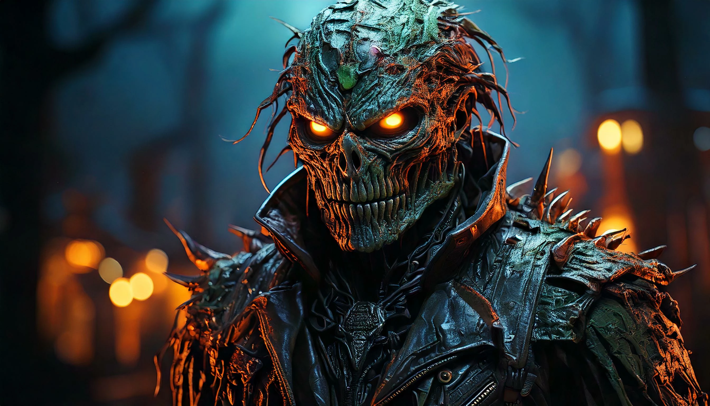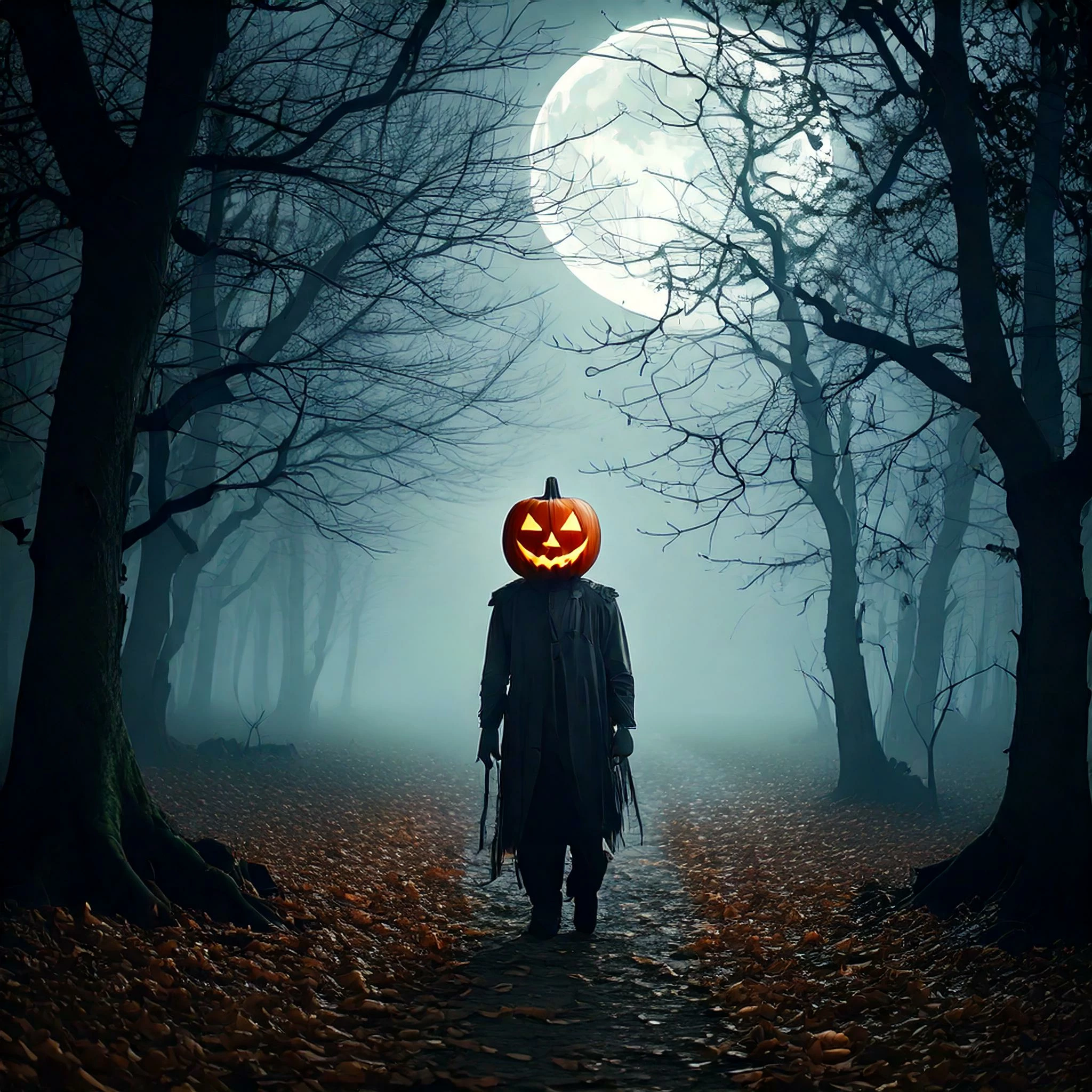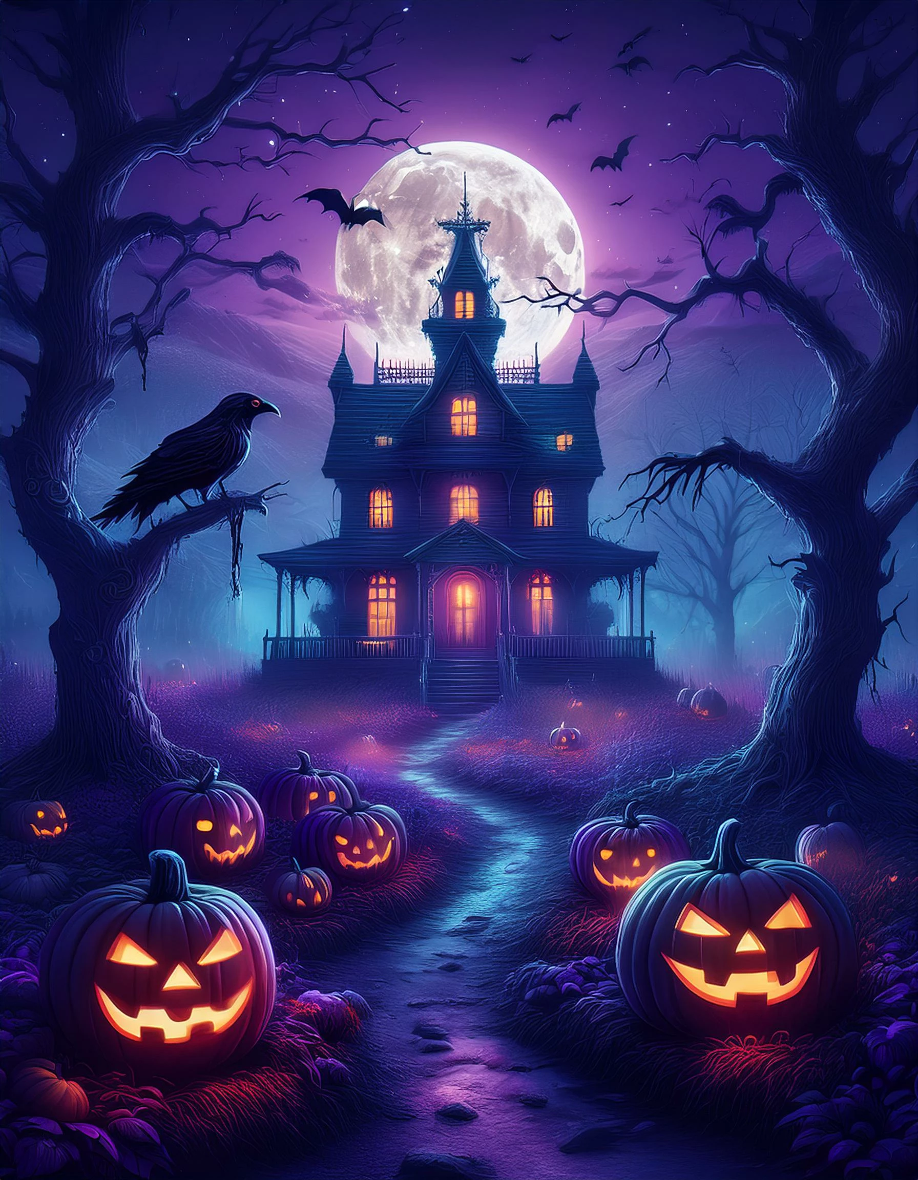 The prompt I used: A spooky pumpkin patch at night, with jack-o’-lanterns glowing ominously. Include scarecrows, black cats, and a misty background to set the scene.