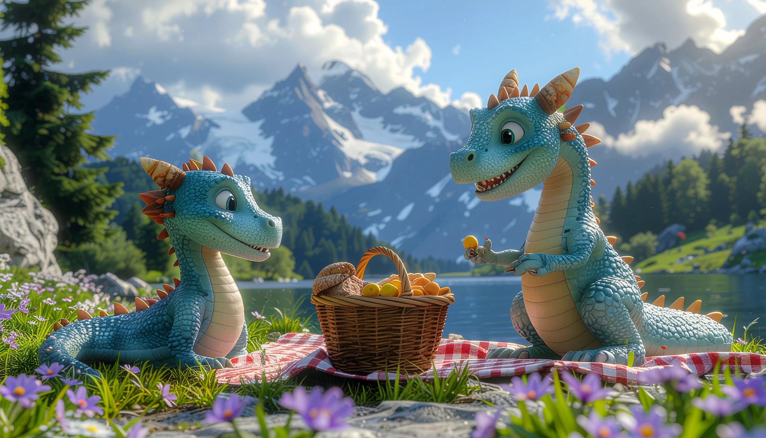 3 dragons enjoying Summer Picnic at the Lake in mountains with family