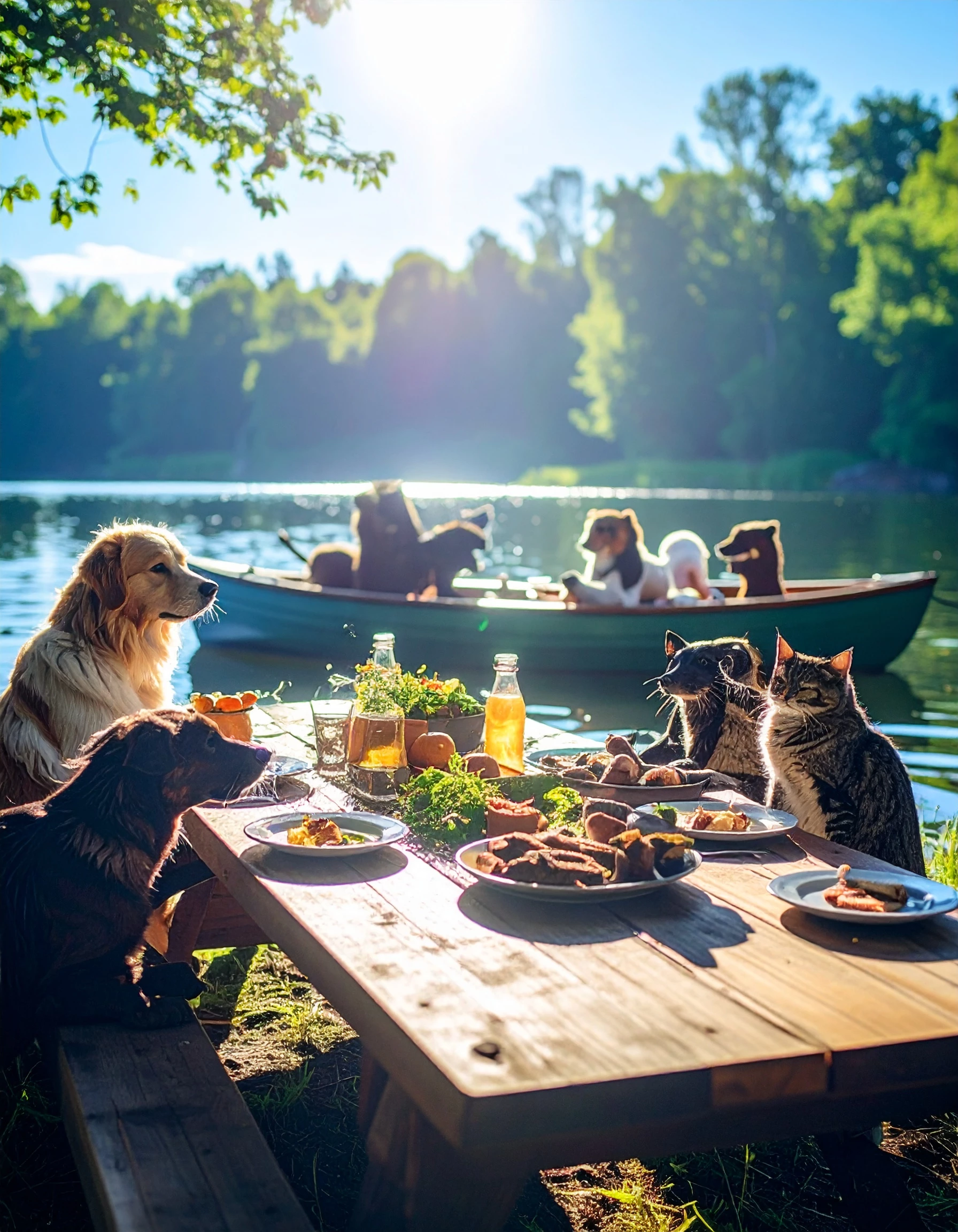prompt: Animals enjoying a meal at a picnic table spread out by a lake in summer sunshine. Cats and dogs playing in a rowboat, otters swimming.