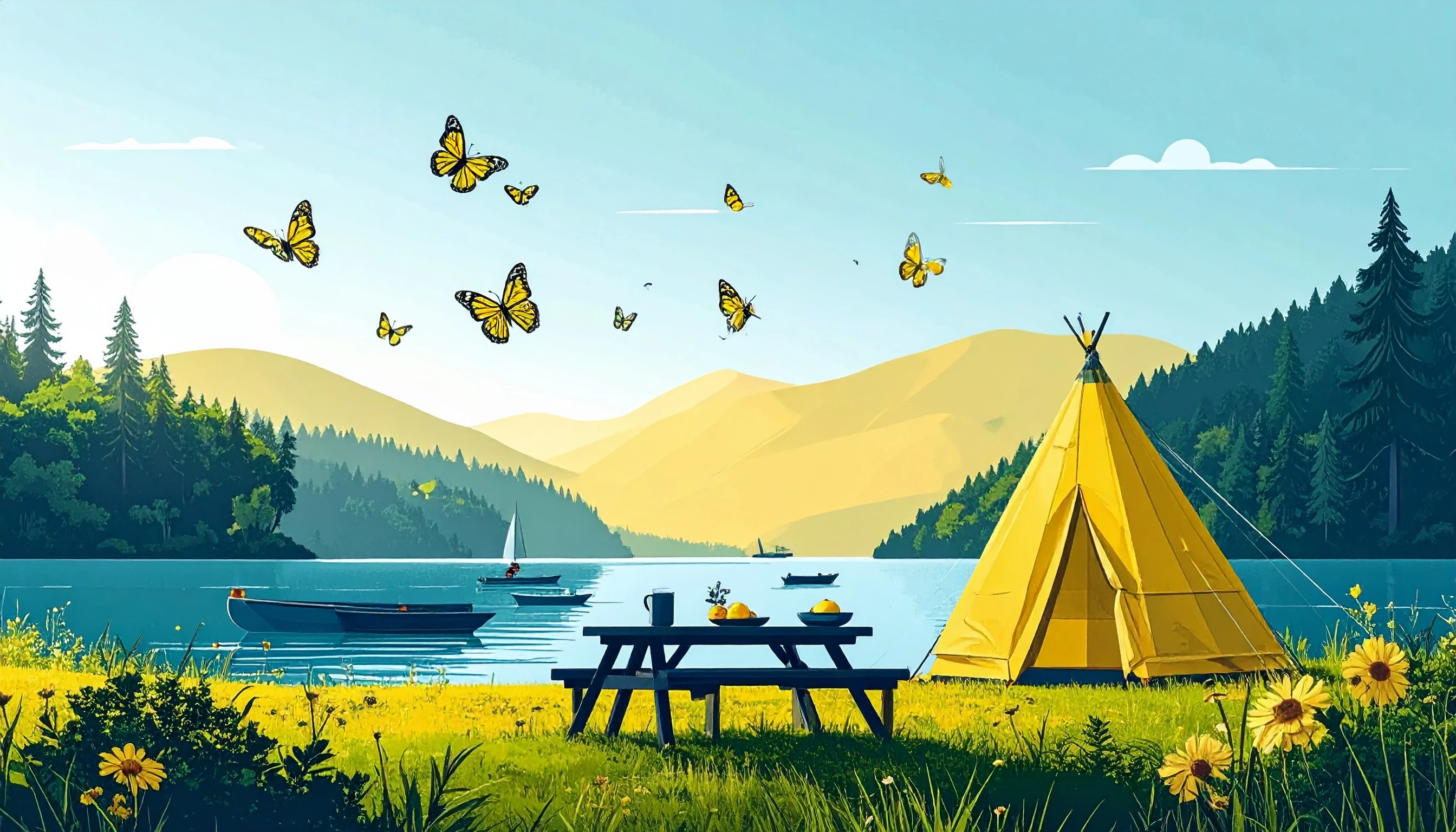 The prompt I used: Whimsical storybook illustration of a summer picnic by a magical lake, checkered blanket under a tree, fruit baskets, lemonade jars, kids chasing butterflies, a napping dog, and a rowboat on shimmering water. Soft textures, pastel colors, and dreamy, hand-drawn details.