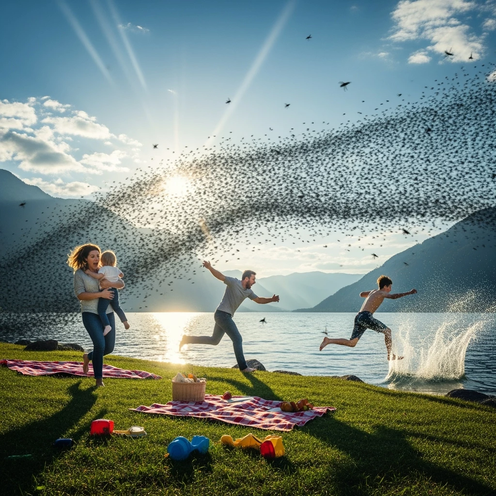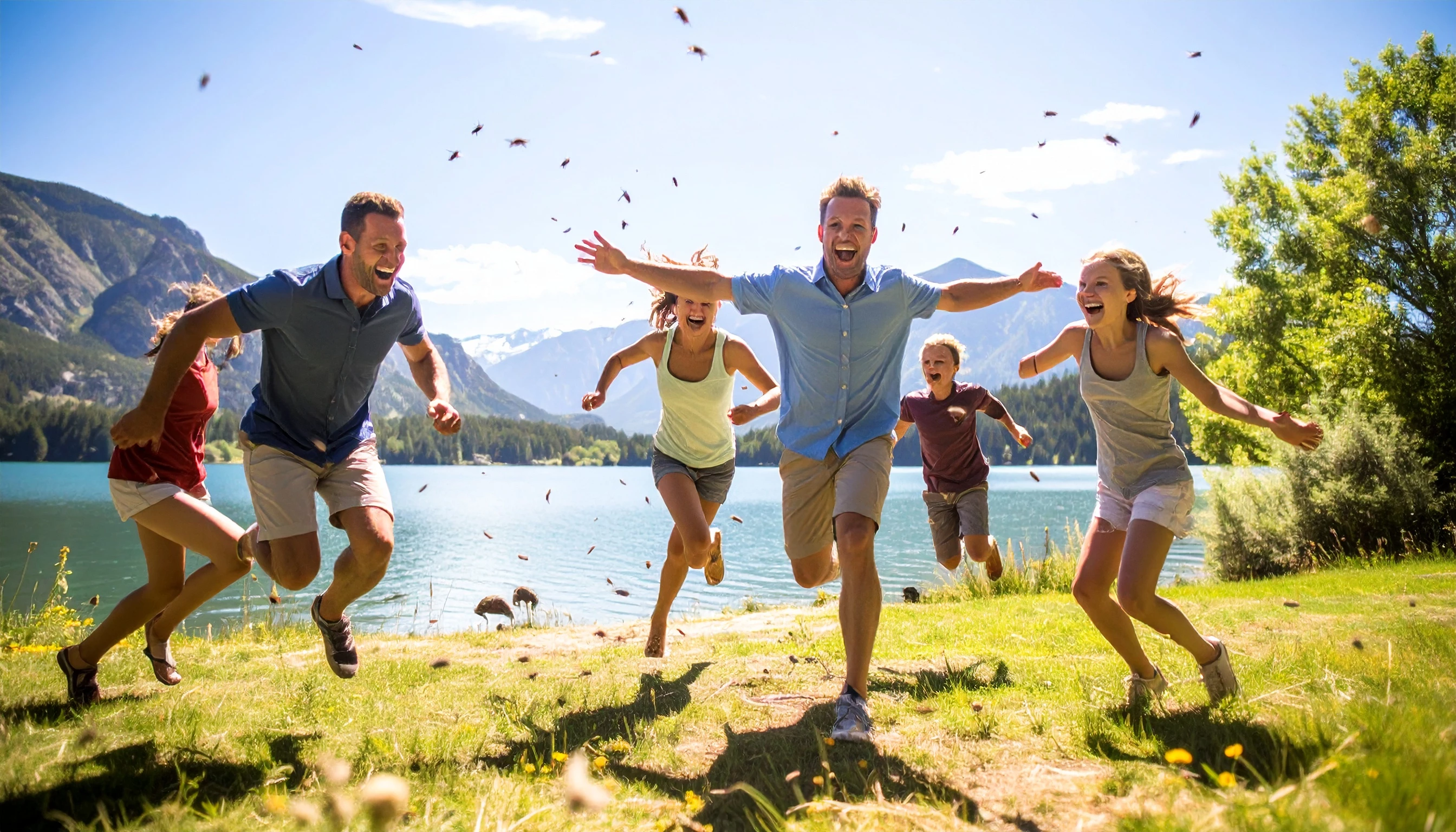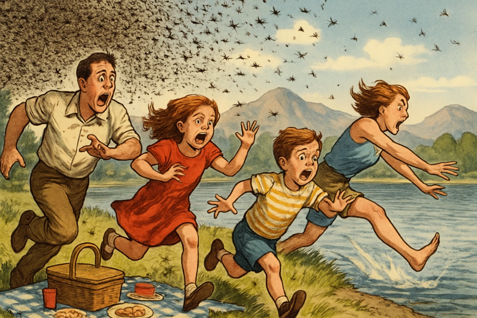 Interesting comparing the models using the same prompt: Terrified family running around franticly being chased by a swarm of insects at a family picnic by the edge of a lake, one person is jumping in to the water, sunny day with mountains in the distance