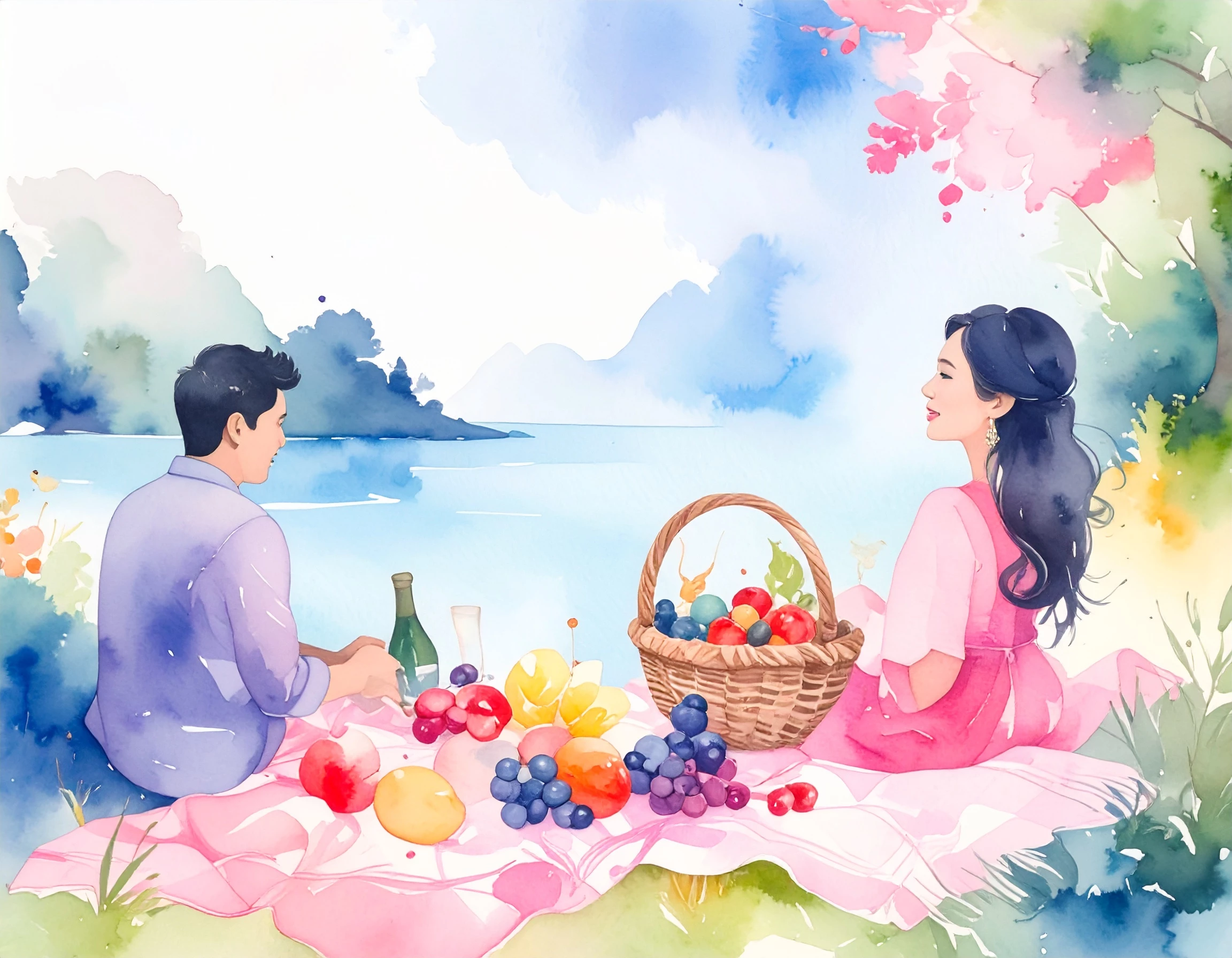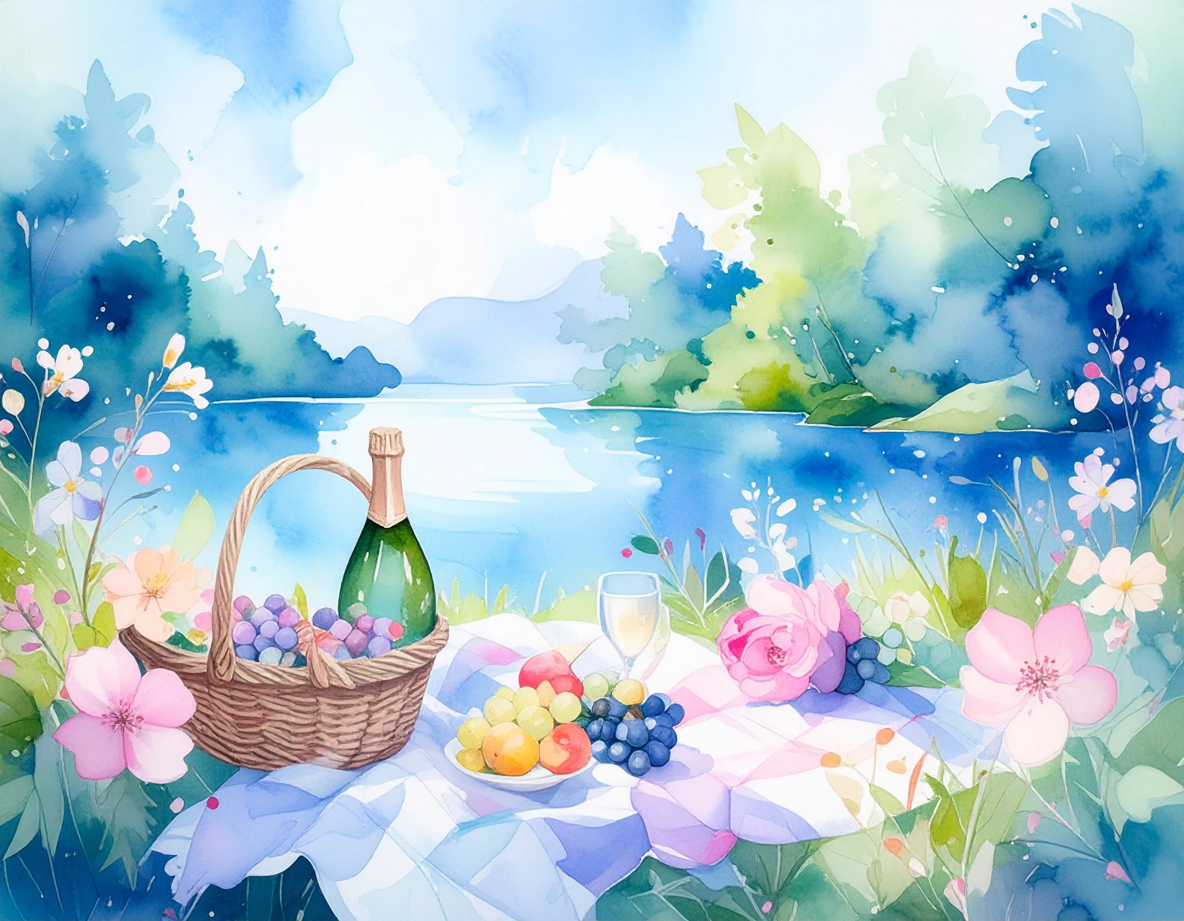 Prompt: Setting: a beautiful summer day, a patchwork quilt placed on the ground beside a magnificent lake, beautiful woodland all around, fruits and champaign in a wicker picnic basket sitting on the quilt; a couple enjoying the day sitting on the ground