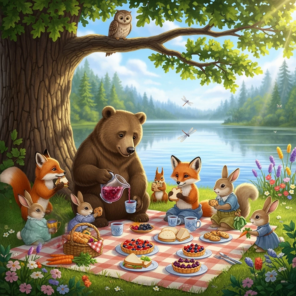 Prompt: Forest animals gathering for a picnic, under a tree lakeside.