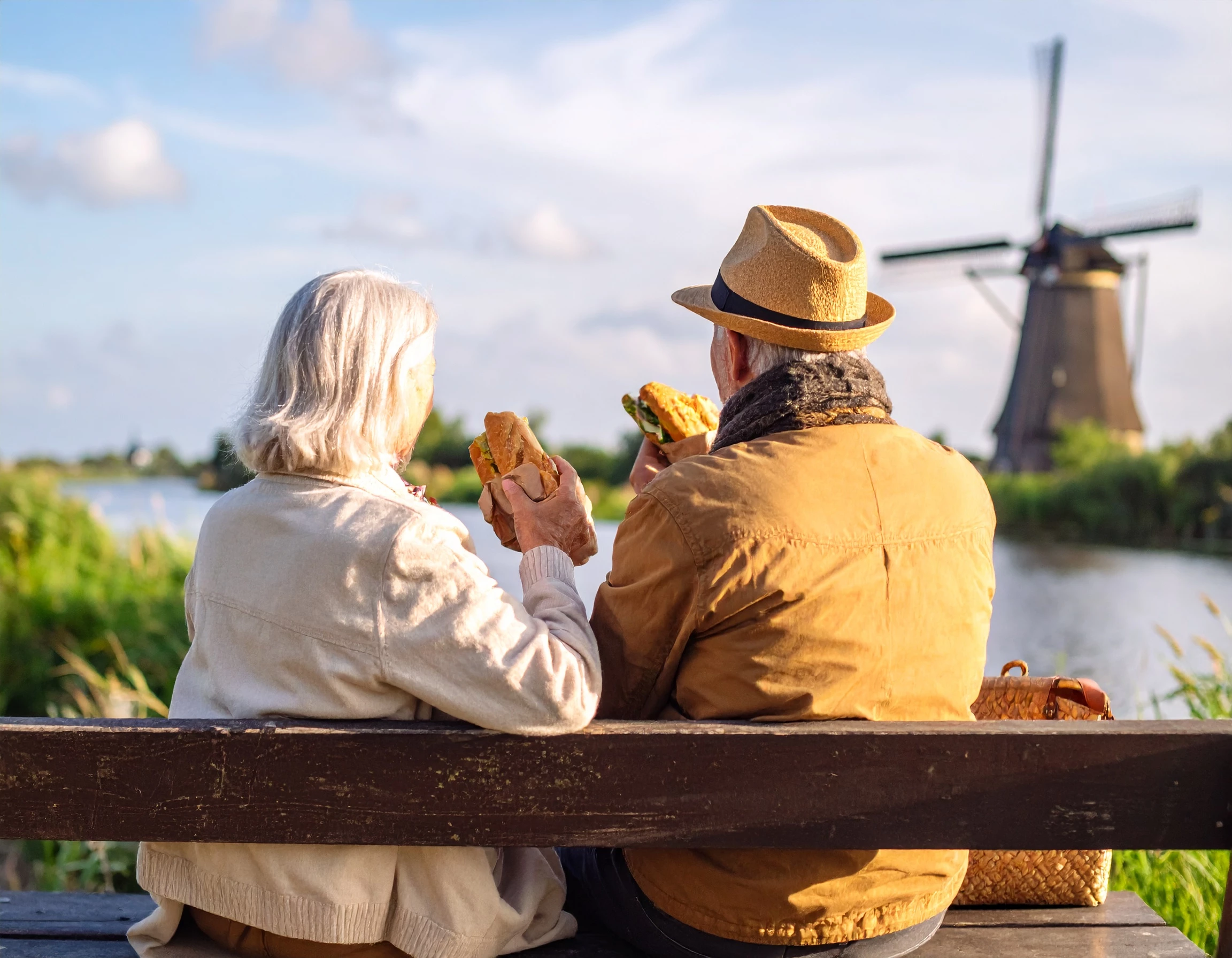 Prompt: An older couple enjoying sandwiches near a dutch canal with a distant windmill in the background. They are seated on a bench. View of the camera is over the shoulder from behind.