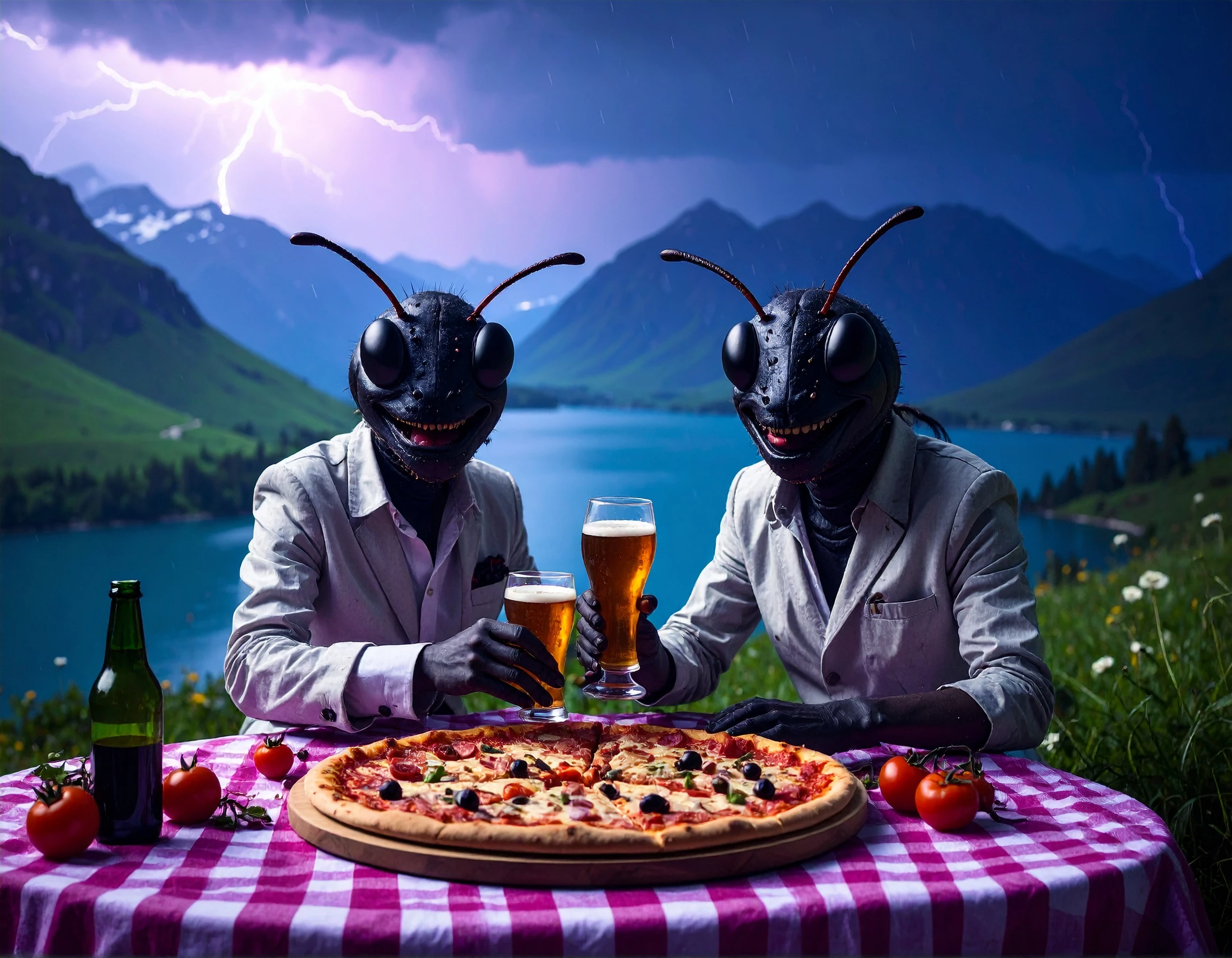 Prompt: Surreal, photorealistic. A photorealistic image of humans with heads like ants that are smiling and very happy having a picnic of pizza and beer on a checkered sheet near a scenic lake. There is a severe hurricane with heavy rain and lightning going on and there is barely any sunlight.