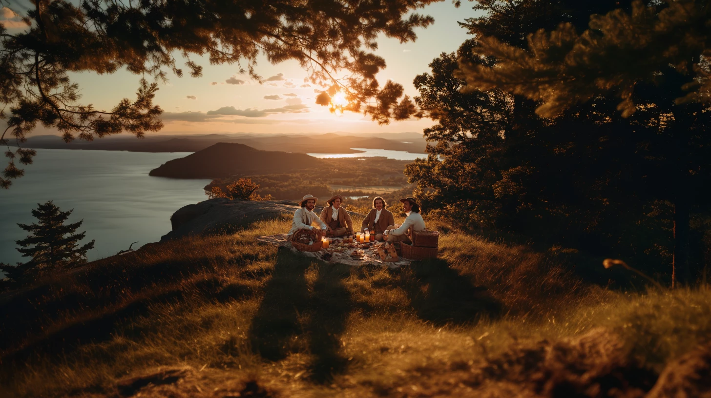 Golden hour photograph, George Washington, Abraham Lincoln, Thomas Jefferson, and Benjamín Franklin enjoying a picnic on top of a hill, relaxed and smiling around a blanket spread with sandwich baskets and orange juice, shot from a natural eye-level angle; background reveals a scenic landscape with a large lagoon, lifestyle photography style.