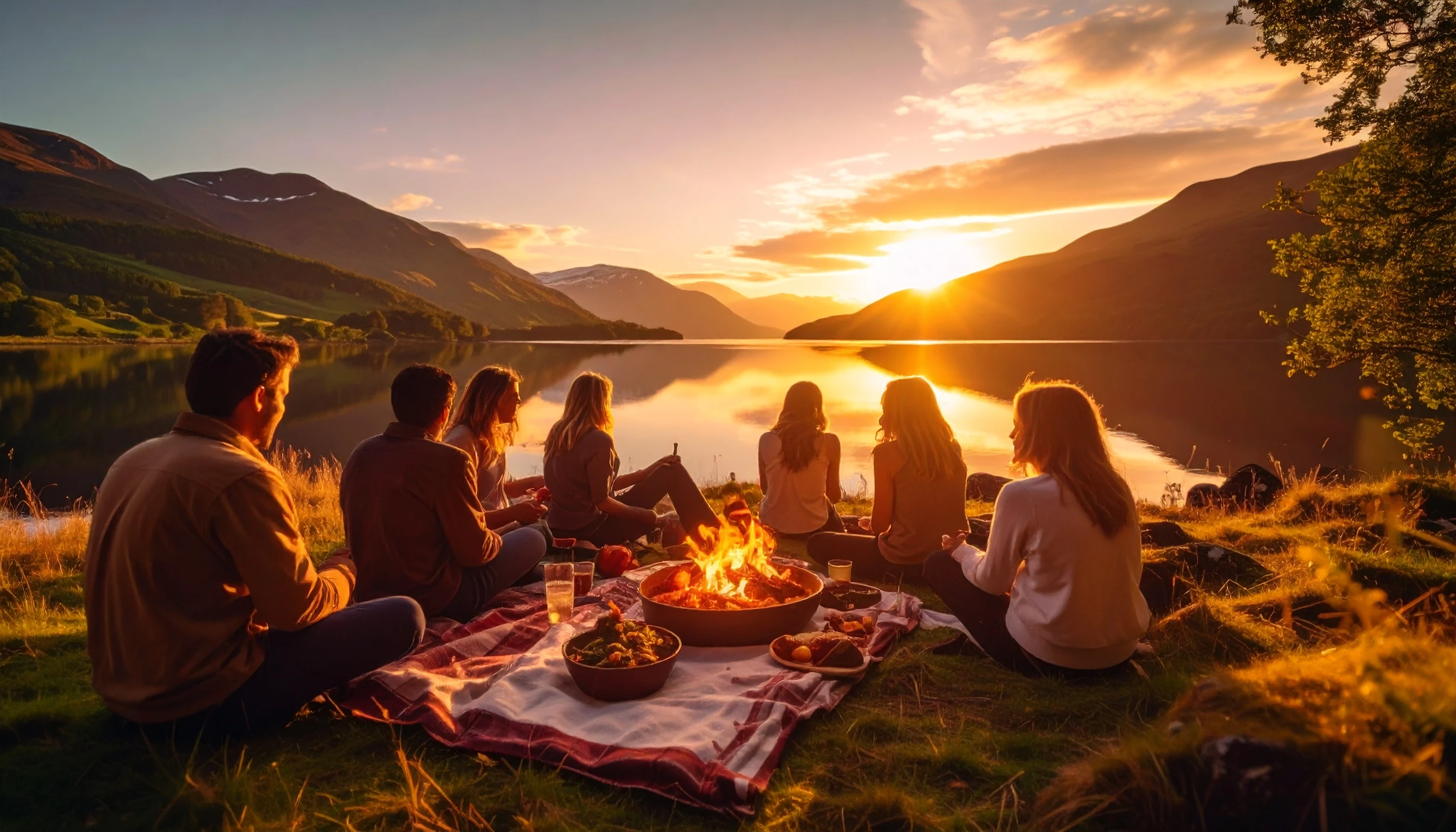 A group of Scottish friends sitting by a loch. They are having a picnic with Scottish food.