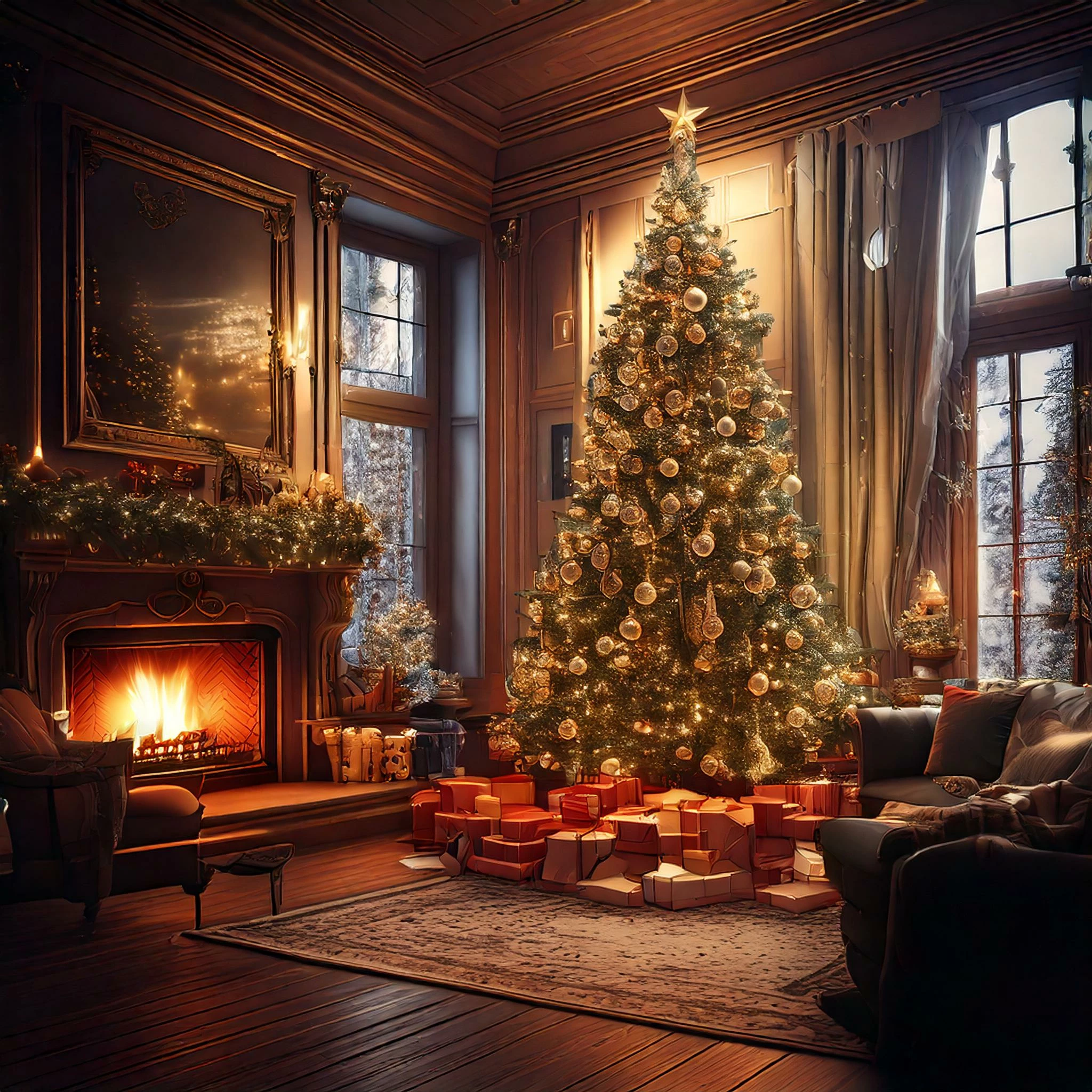 classy cozy time - cosy Christmas, big room, fire, tree. many lights, ski
