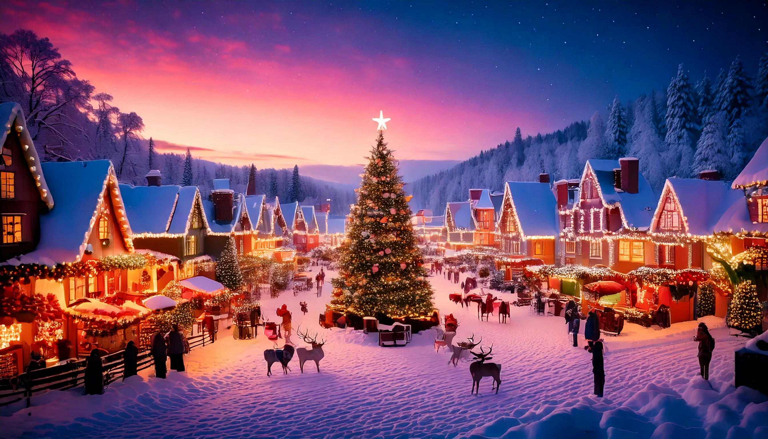 The Prompt I used: A cozy, snowy Christmas village with colorful houses, a decorated tree in the square, and festive shops. People in winter coats walk around as snowflakes fall, and street lamps cast a warm glow, with snow-covered mountains in the background.