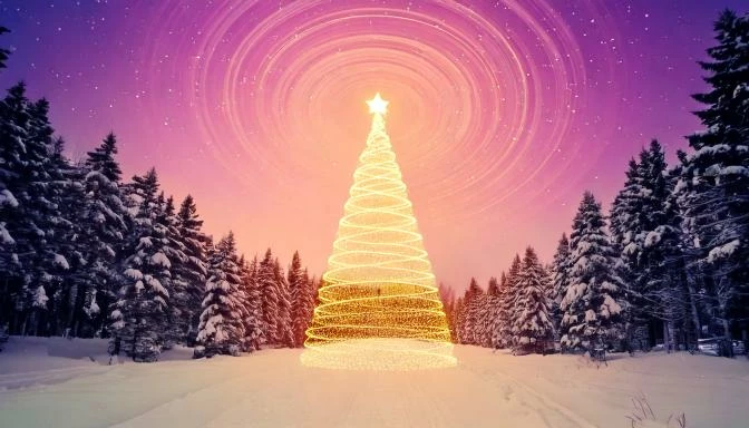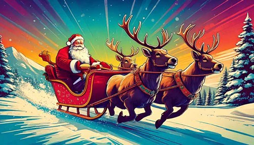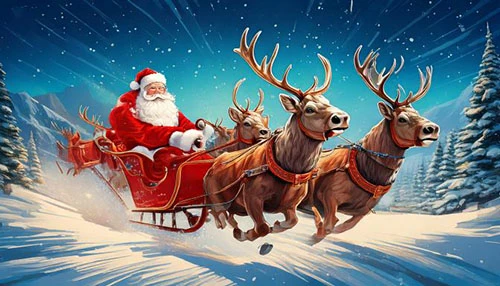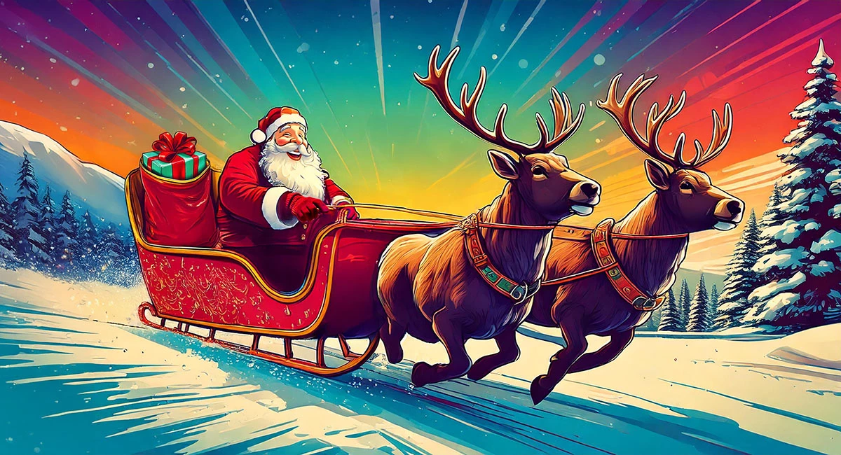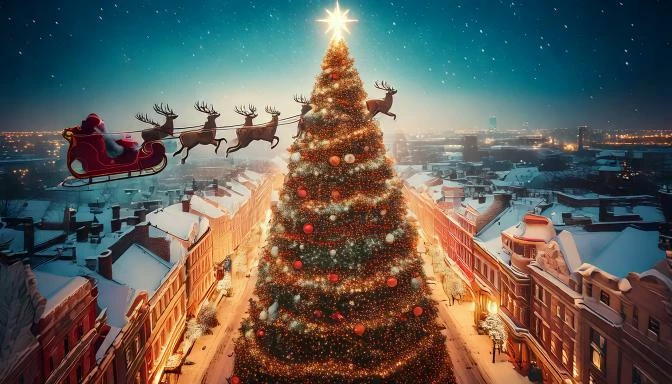 Santa Claus in sleigh pulled by 9 reindeer flying High around the top of a tall decorated Christmas tree in a town square. Like the retro feel to this but boy did Firefly not like this, many attempts and rewritten numerous time