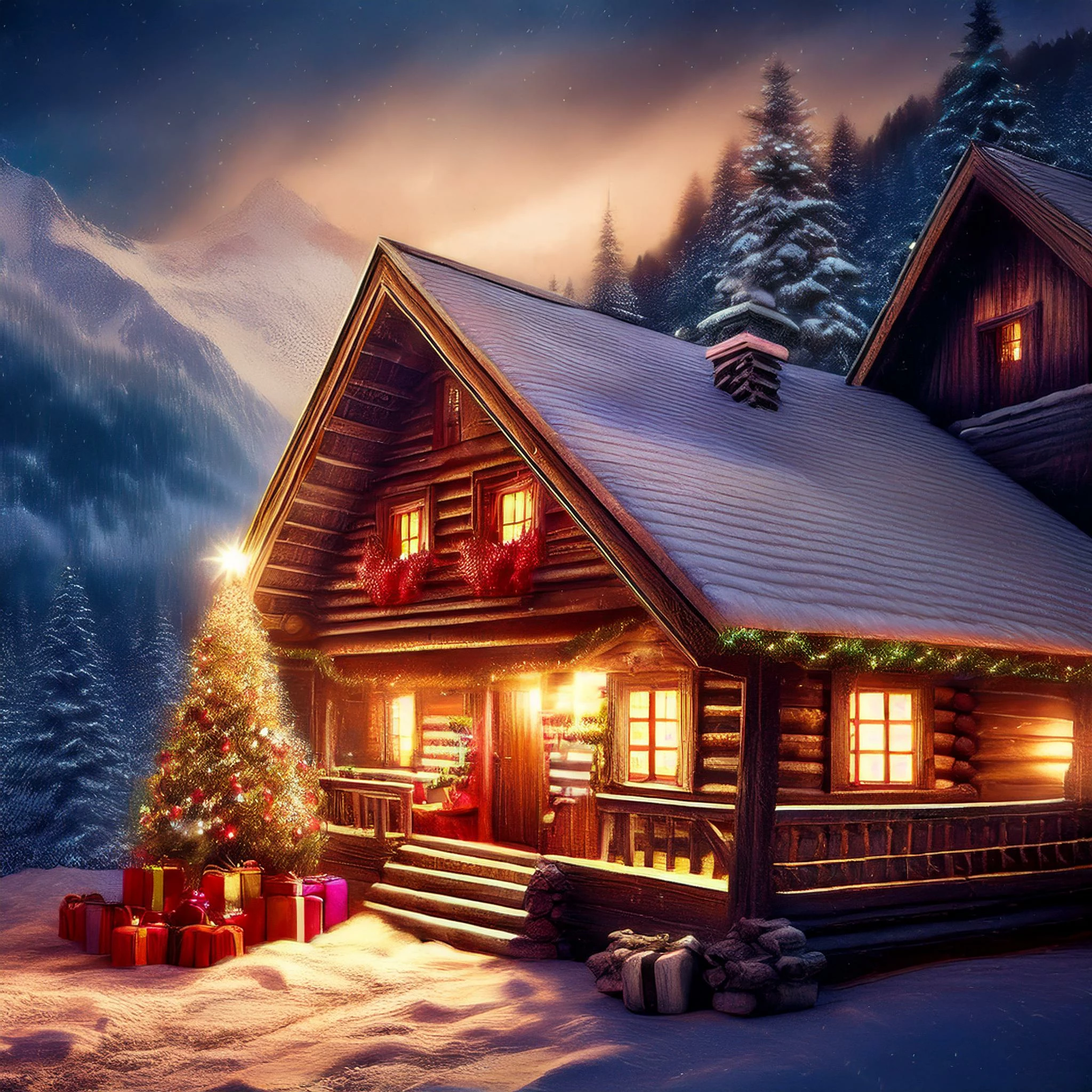 Prompt: A wooden chalet, with red slats and a brown roof, in the mountains. It's night, and a warm light streams in through the windows. Next to the chalet is a Christmas tree, decorated with tinsel and a star at the top. There are presents at the foot of the tree.