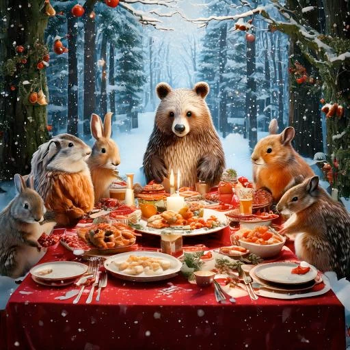 A forest with snow with all the happy forest animals around a table full of christmas food.