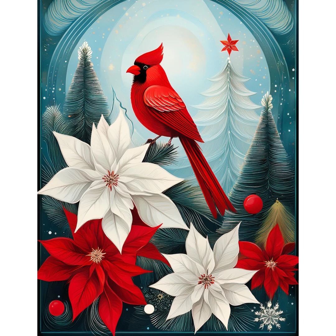 Abstract expressionism surrealism Winter Wonderland scene with white and red poinsettias, cardinal, Christmas tree with lights, large snowflake