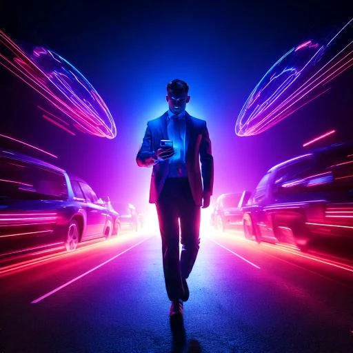 man in a suit walking down the road with an android phone transported to the future with flying cars