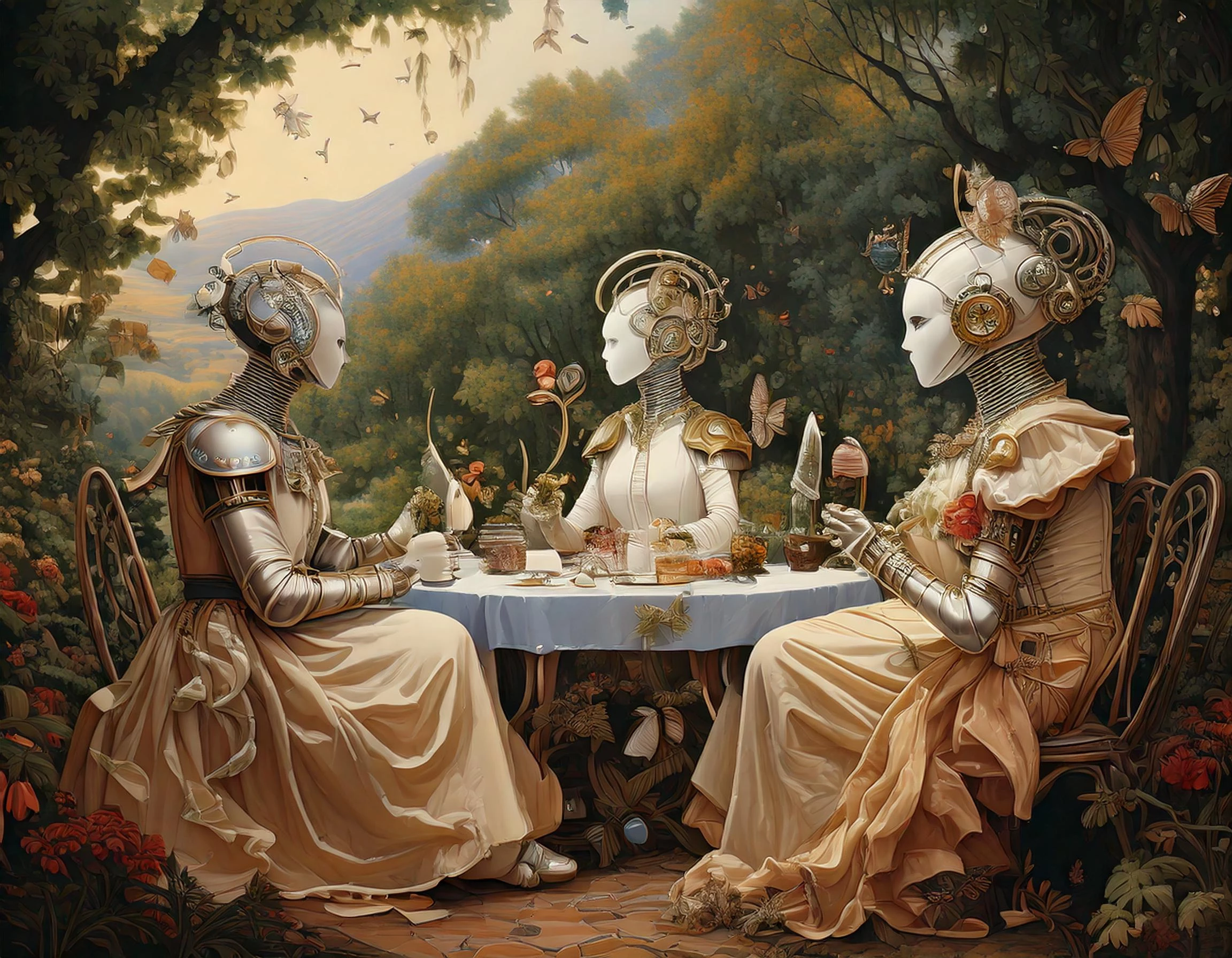 a garden party scene in renaissance style, distant future, futuristic cyborg people sitting down and communicating through futuristic head pieces; insects and butterflies; watercolor on paper