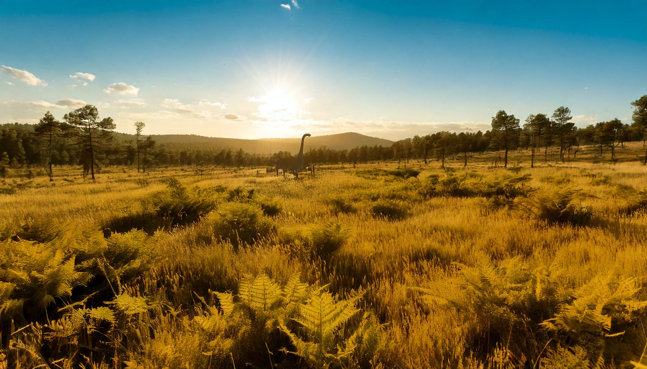 Une plaine immense, avec différentes sortes de dinosaures, des pins, et des fougères.