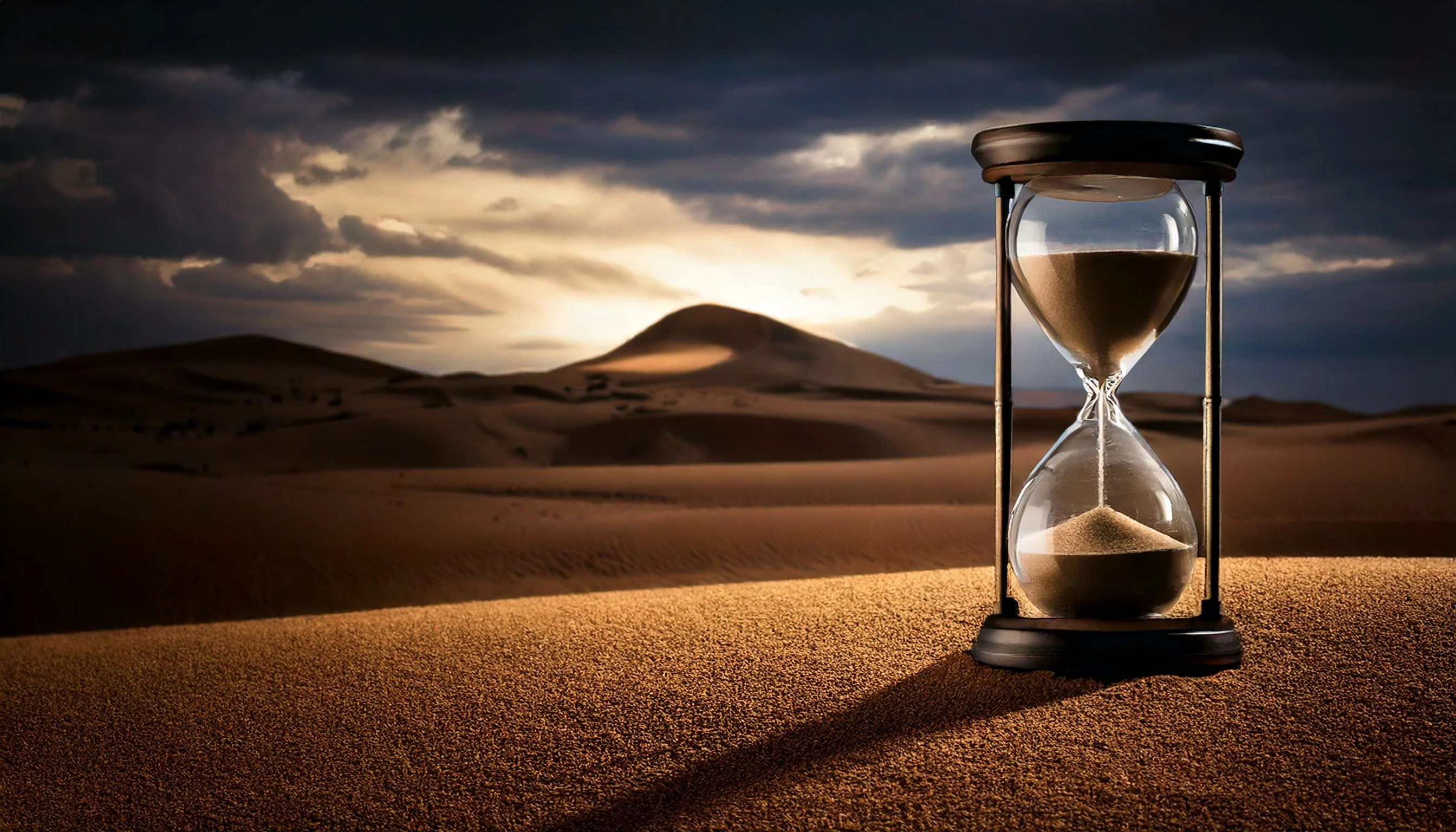 An hourglass timer in the foreground with a backdrop of sand dunes and an ominous sky. Dark and gothic style.
