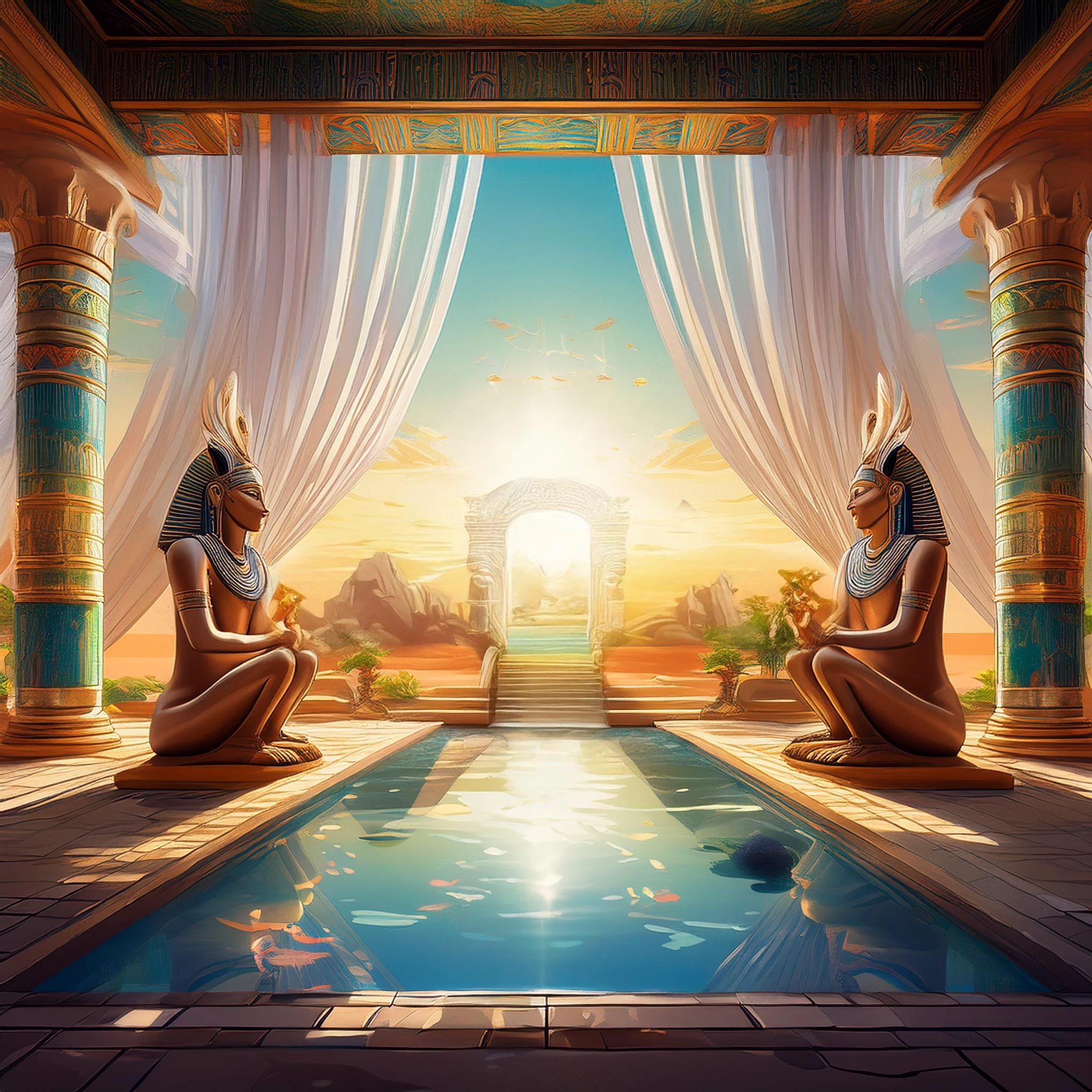 Prompt: The scene is set in a Royal Palace in ancient Egypt. There is a spring in the centre of the room for bathing. Statues of Egyptian gods are placed in the corners of the room. A huge bay with highly transparent white curtains gives a glimpse of the pyramids in the distance. Ethereal style