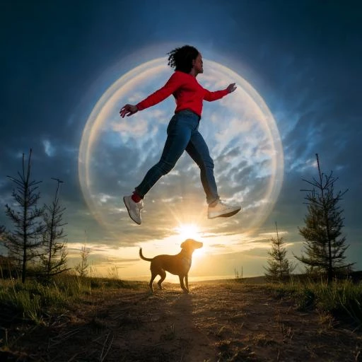 A young Black woman in a red shirt and blue jeans, jumping out of a portal above her head with her dog. The background is an ominous sky with dark clouds, illuminated by a rounded bright beam from behind in the portal that creates light rays around them. In front of them lies a barren landscape, with dead trees on one side. A glowing aura surrounds both characters, adding to their sense of wonder.