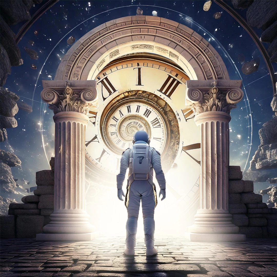 Astronaut facing a time portal made of greek pillars and stone. Vortex made of clockwatch numbers in spiral in background.