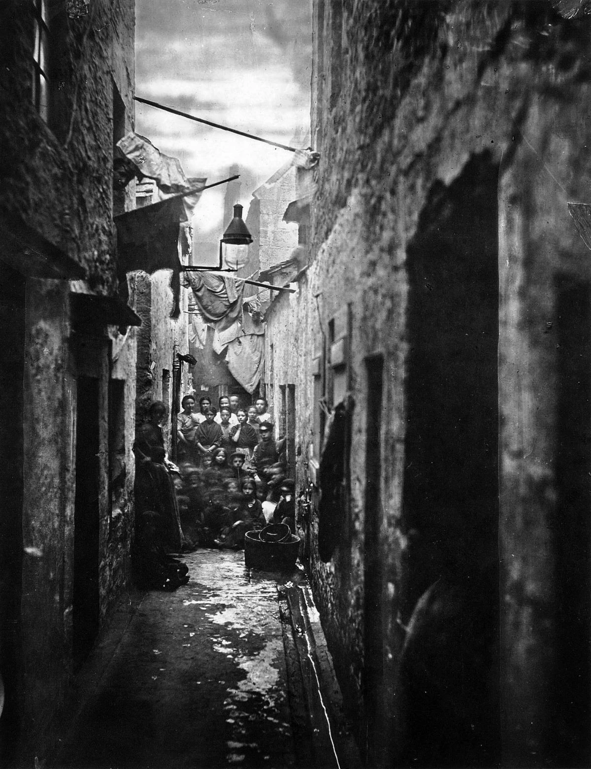 An ancient Scotsman emerges through a time warp into current timeframe scotland. A skyscraper can be seen in the distance. The ground is a high tech metal.