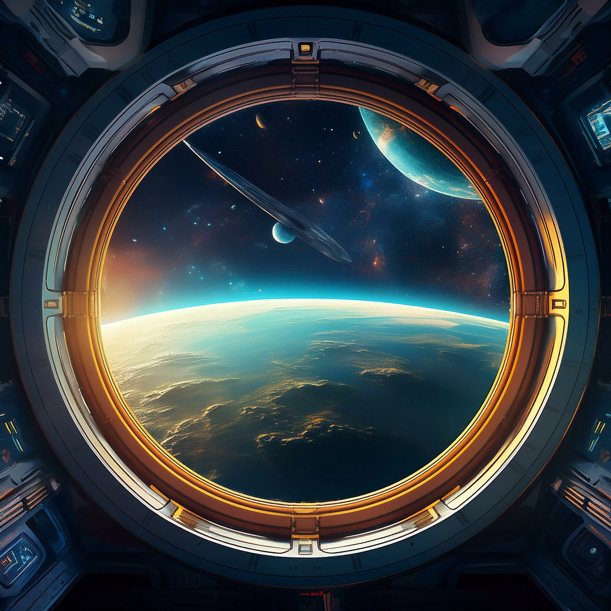 view from through the window in a spaceship up in outerspace