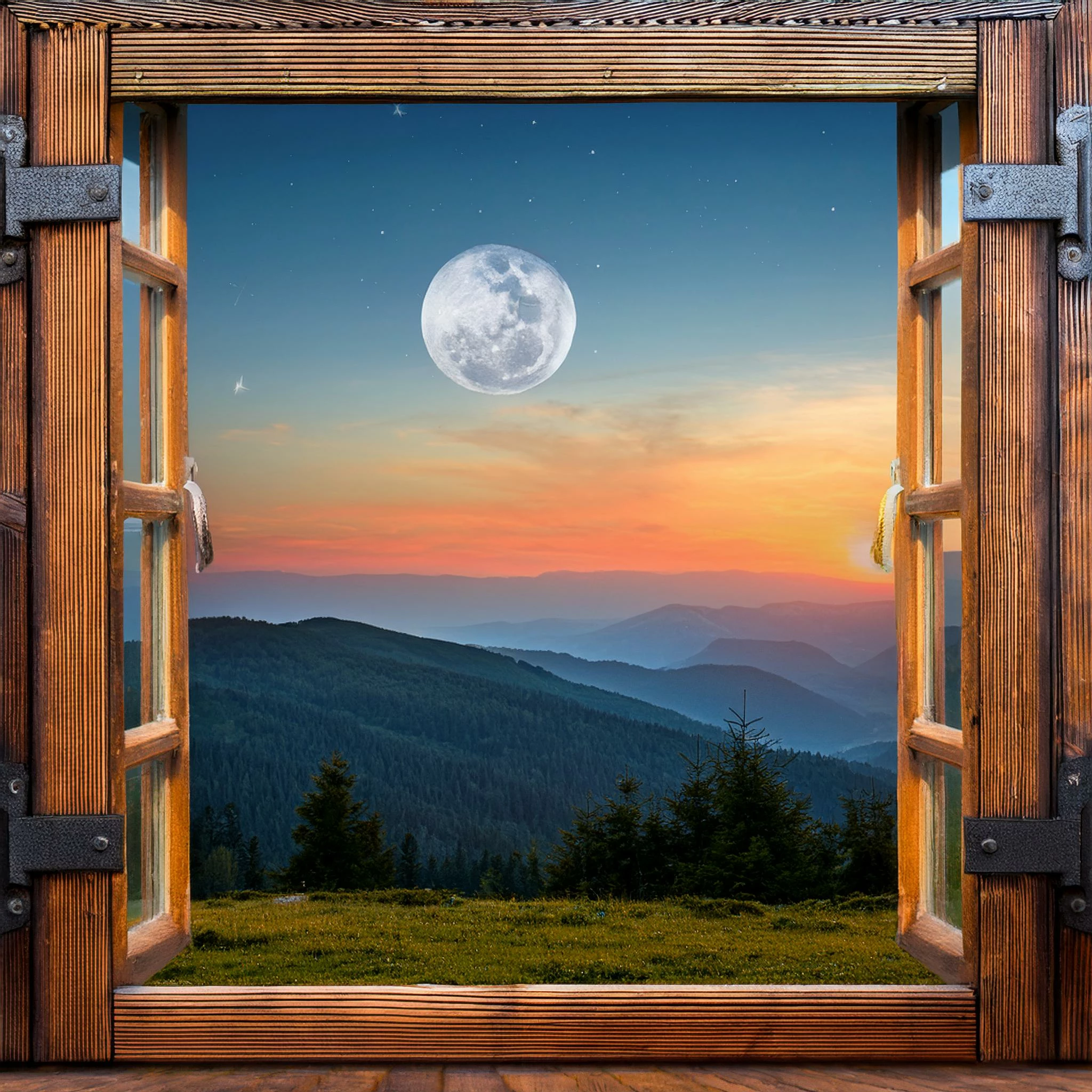 Prompt : through my wooden window view a magestic sunset with big moon on the mountain