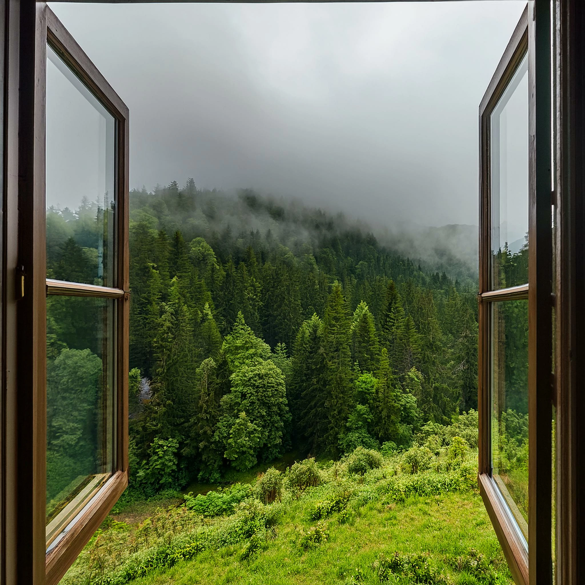Prompt :- scene from my window opening into a hillside with dense forest, the afternoon is misty right after rains and it is cloudy.