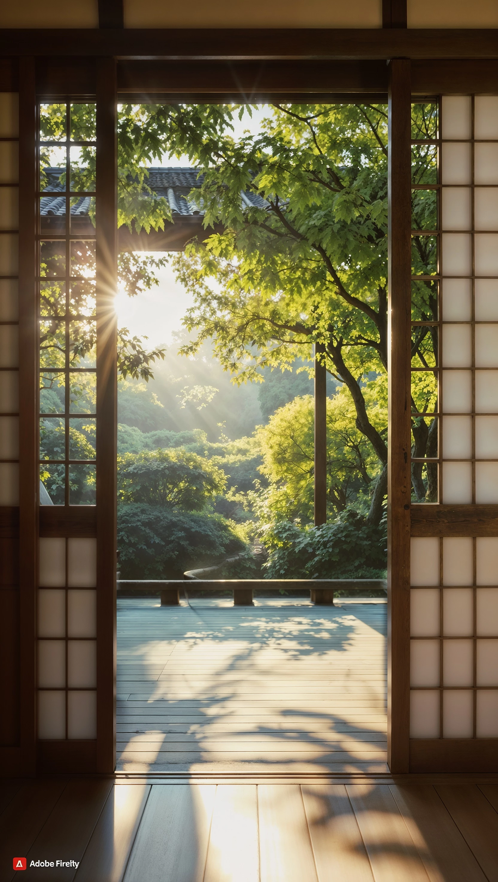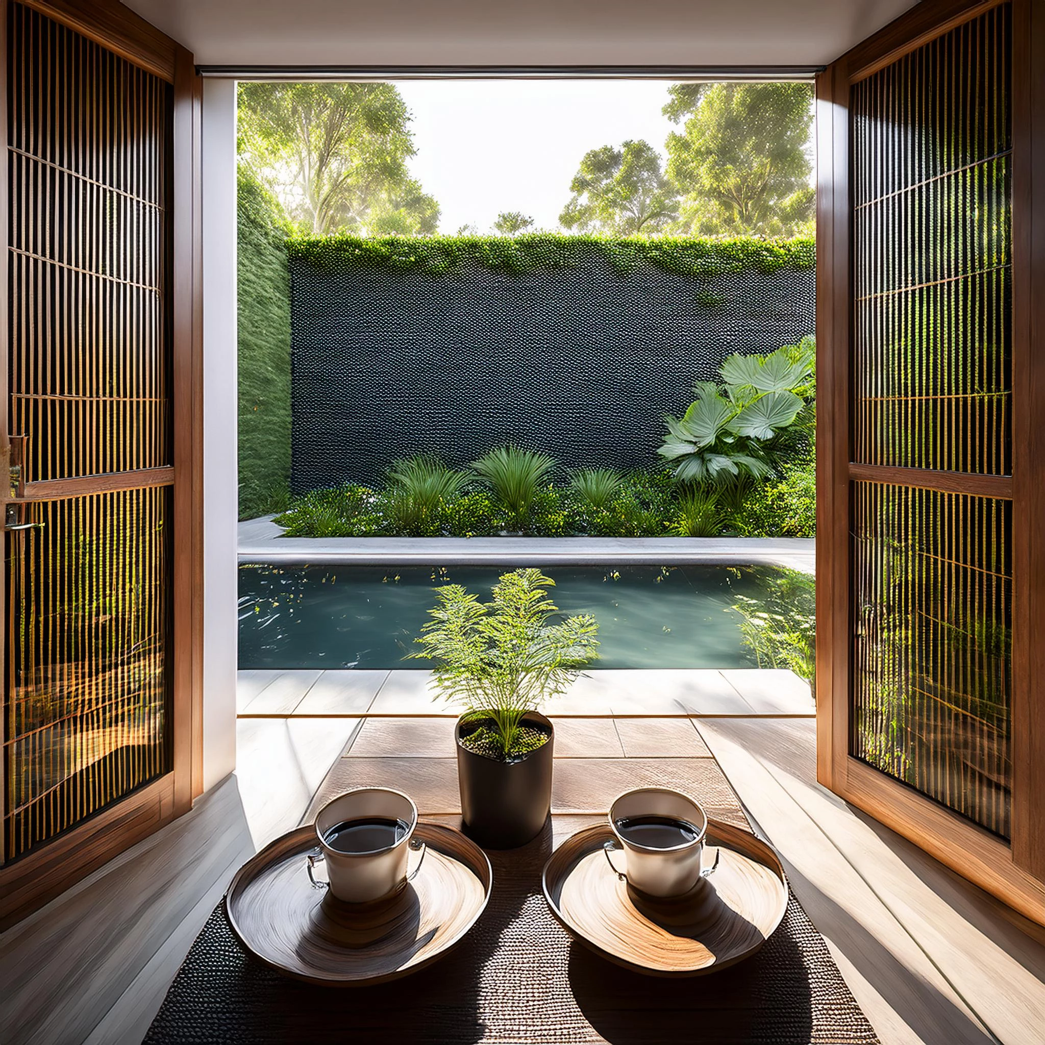 Prompt: Create a look from inside a modernly styled 1930s villa onto a lawn with a wall of lush green plants in the background and a garden house on the left side with a straight pond in front of it, filled with water plants and water lilies. It’s early morning and garden doors are open and there are two cups of steaming italian espresso positioned in the foreground. The background is subtly out of focus, akin to f2.8 on a 16mm lens.
