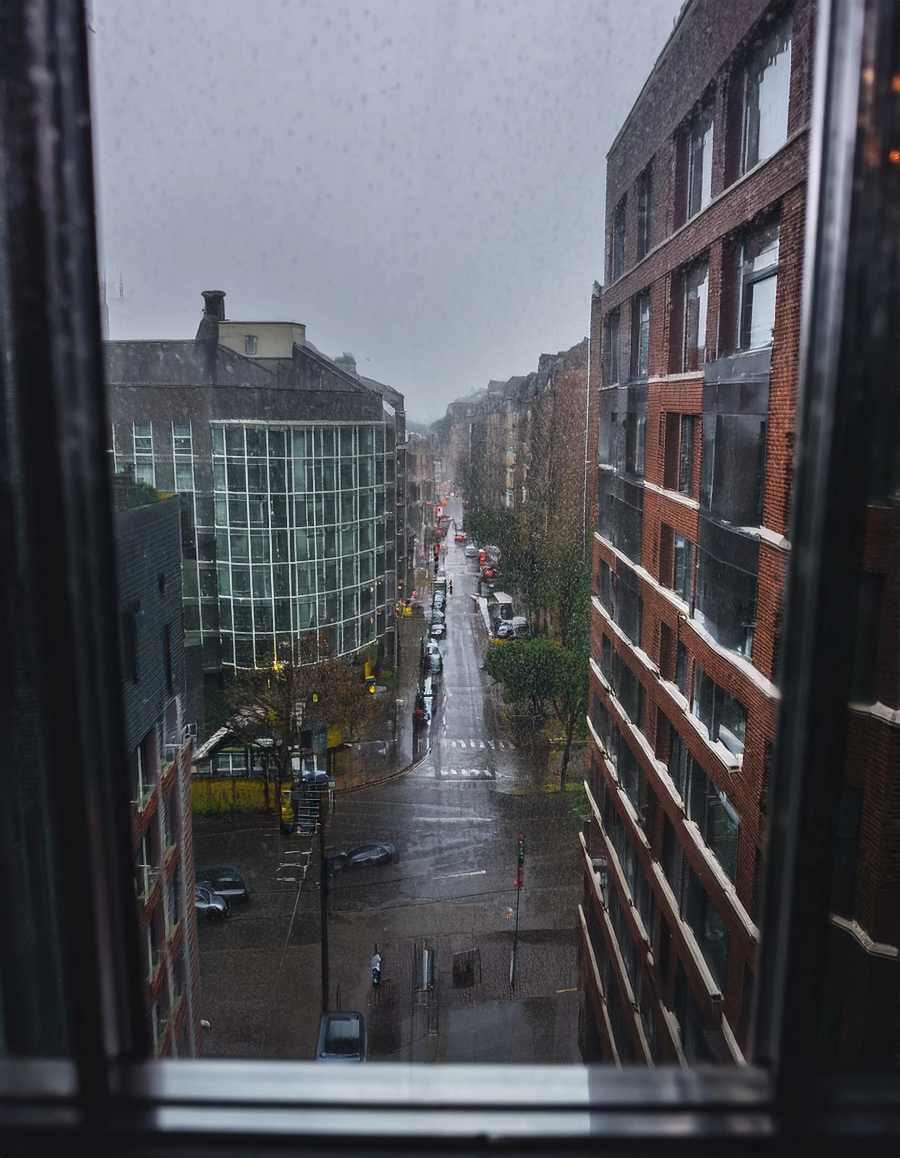 view from through my window frame, rainy day, looking down at a busy street from a high floor of an apartment building on one side of the street. grey, dreary mood. dull colors. raindrops dripping down the window