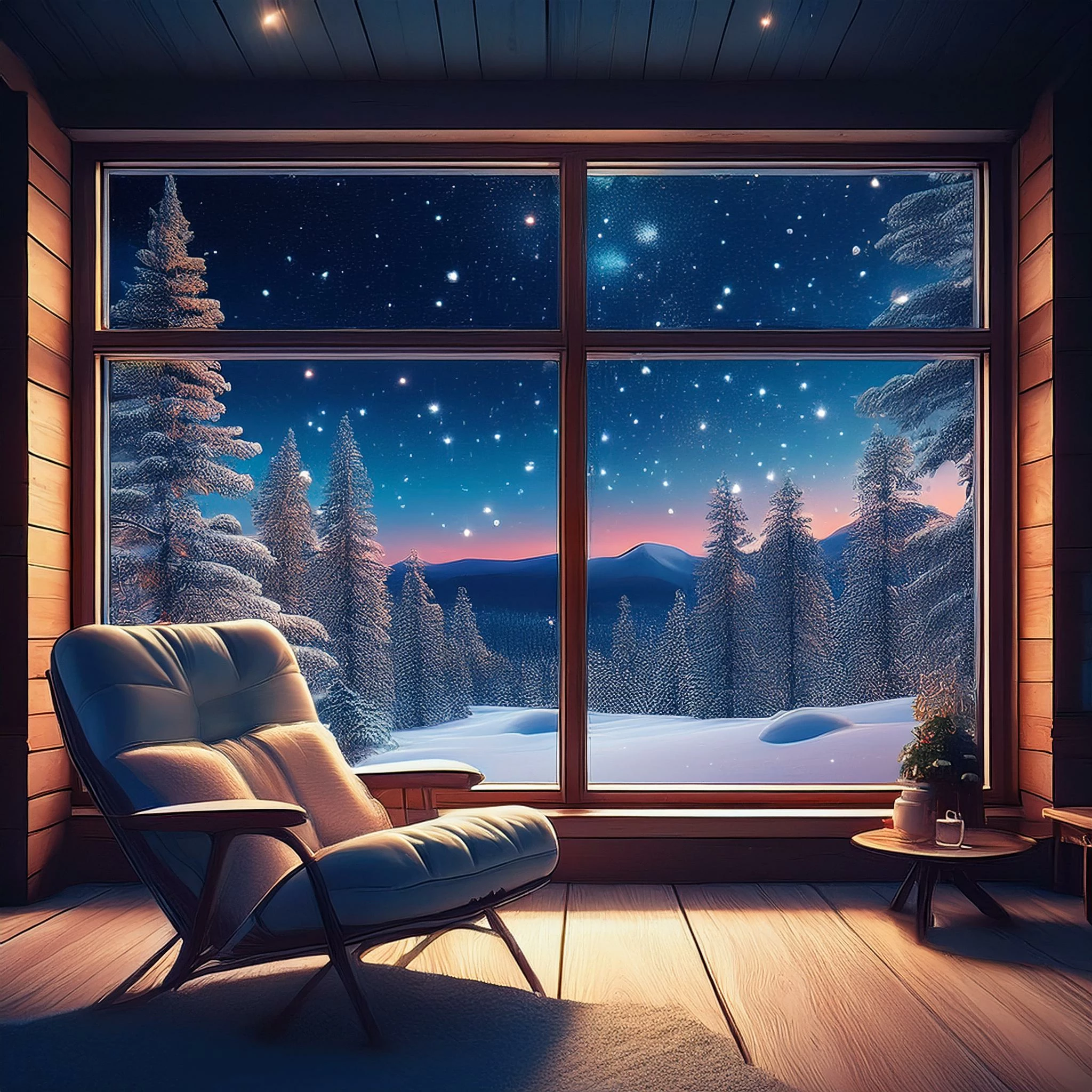 view through my window in my cabin. starry night with visible galaxies in the background far away. the world is covered in a layer of white fresh snow. the cabins around me have snow on their rooftops. inside my cabin there is a peaceful scene with a modern armchair