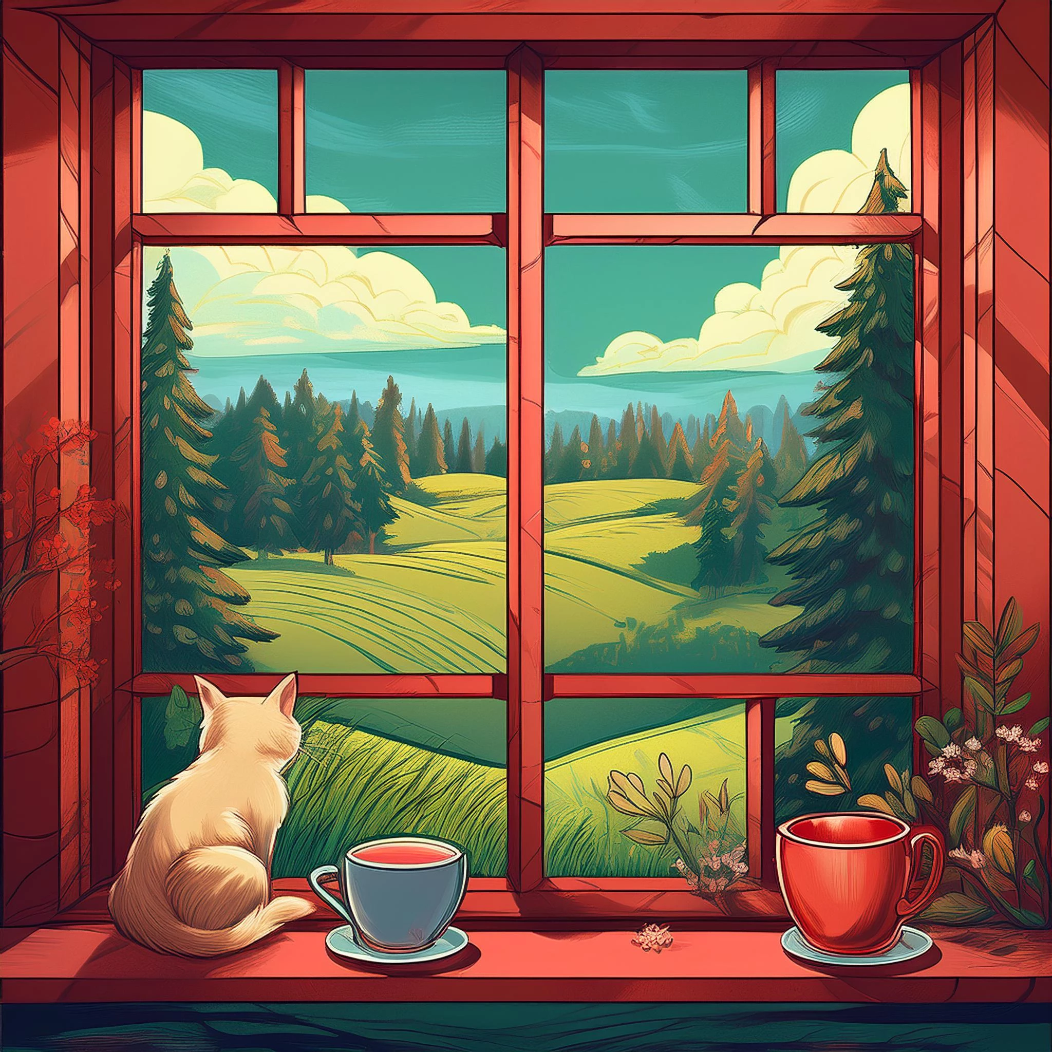 Prompt: la vista desde una ventana de hierro en cuadrícula de 4 pintada de rojo. Se ve el dintel de la ventana con una taza de te. Por fuera se ve un bosque y un prado. Hay unos gatos cerca sobre el cesped por fuera de la ventana