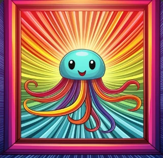 looking out through a window cartoon jellyfish smiling, rainbow warp speed
