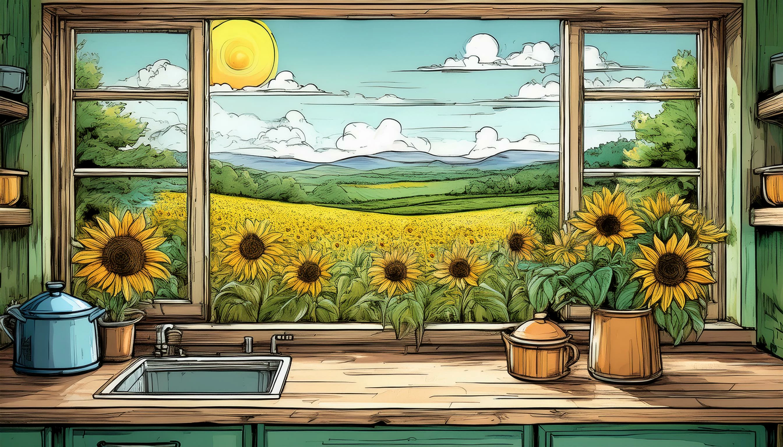 Prompt: view of a beautiful field of sunflowers from a distressed kitchen window