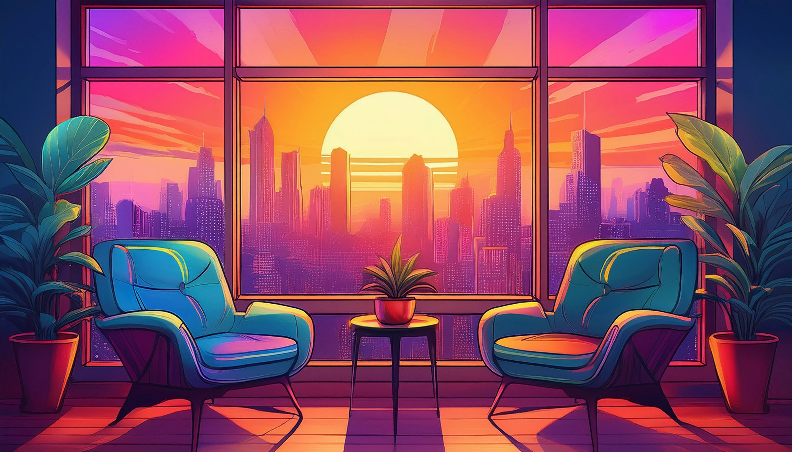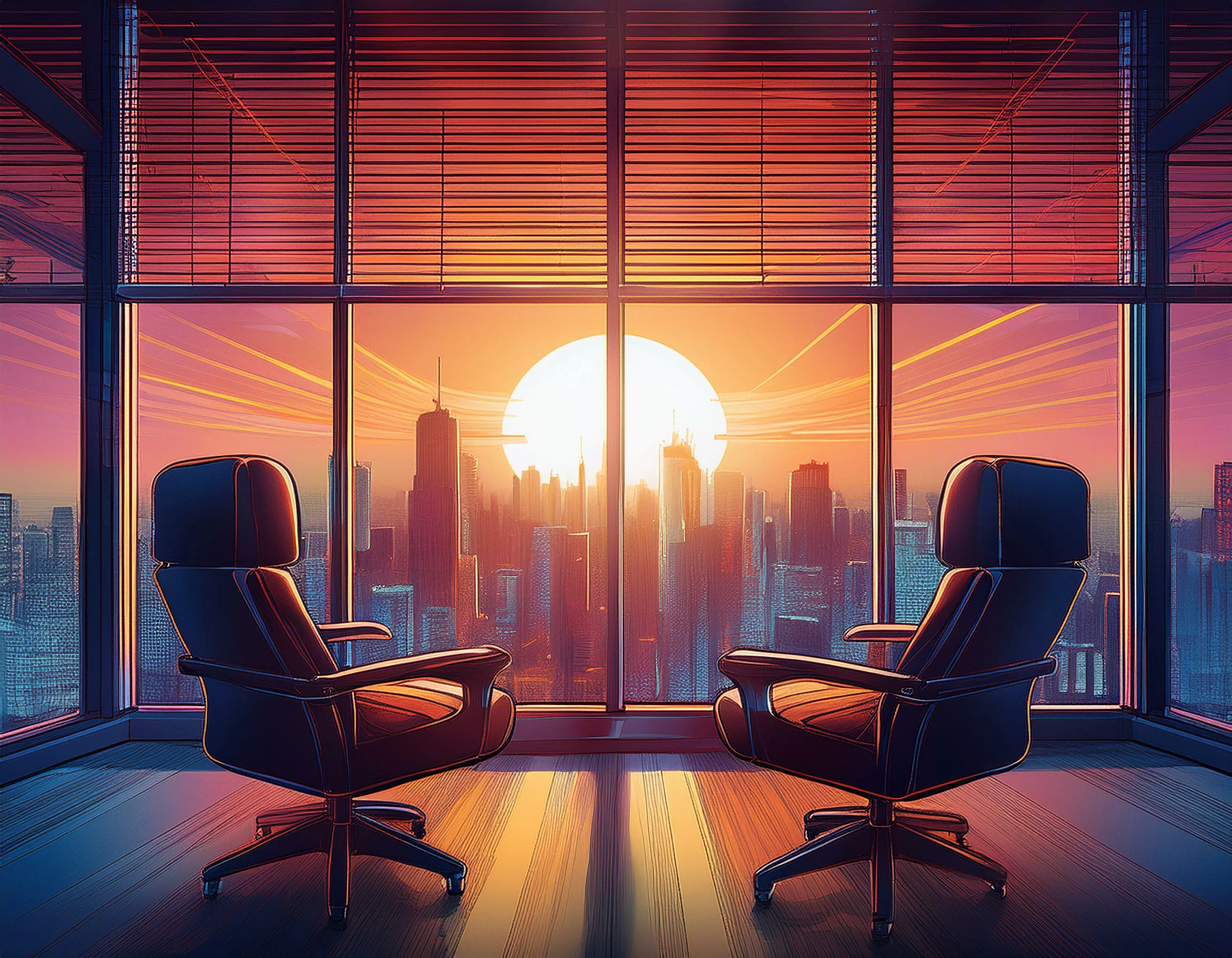 Prompt: view from a modern city window, the sun setting over the city .