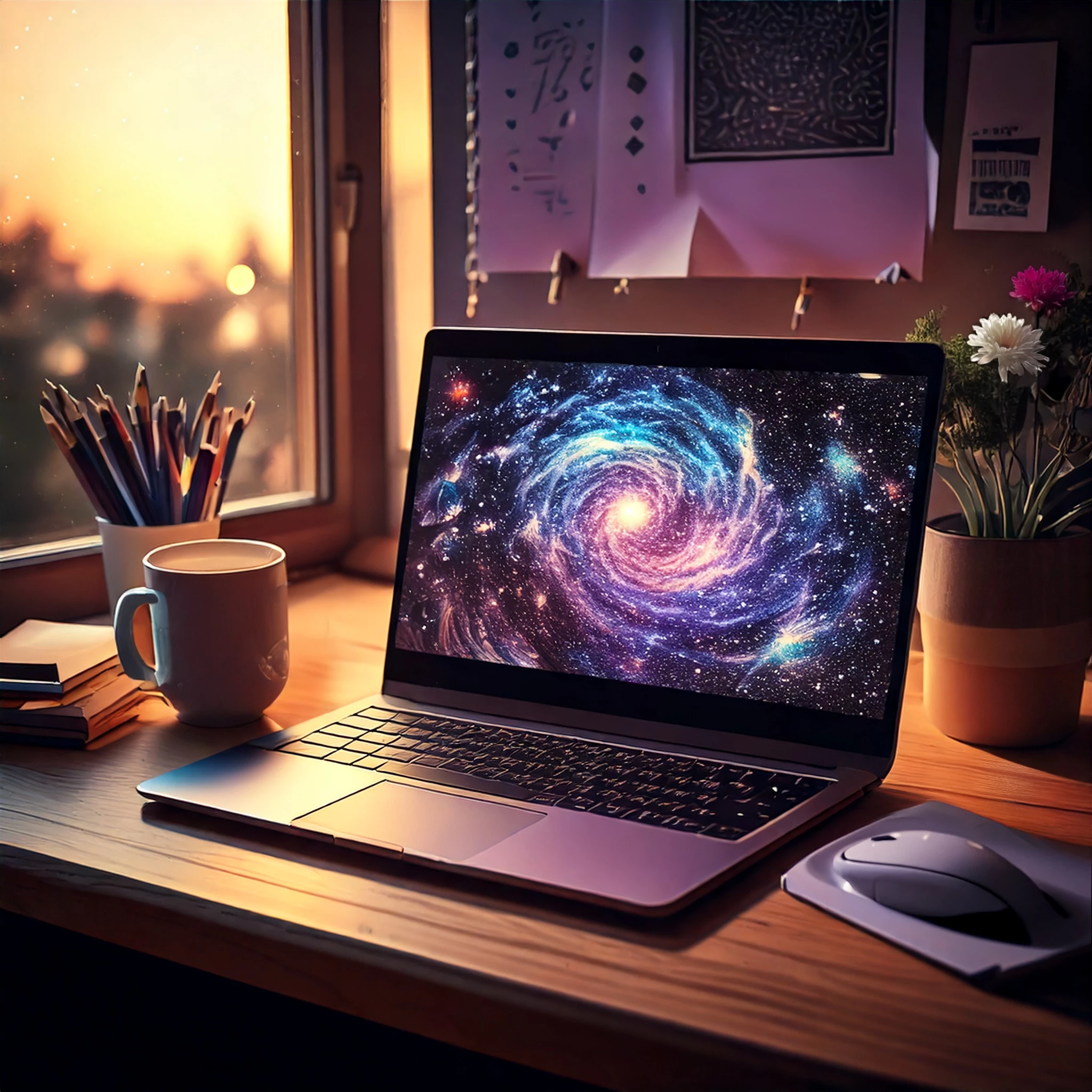The prompt I used: A cozy desk with a glowing laptop with a galaxy swirling, a coffee mug, sketches escaping a notebook, cloud-shaped sticky notes, quills and wands in a pencil holder, and a flower pot. Twilight glows through the window.