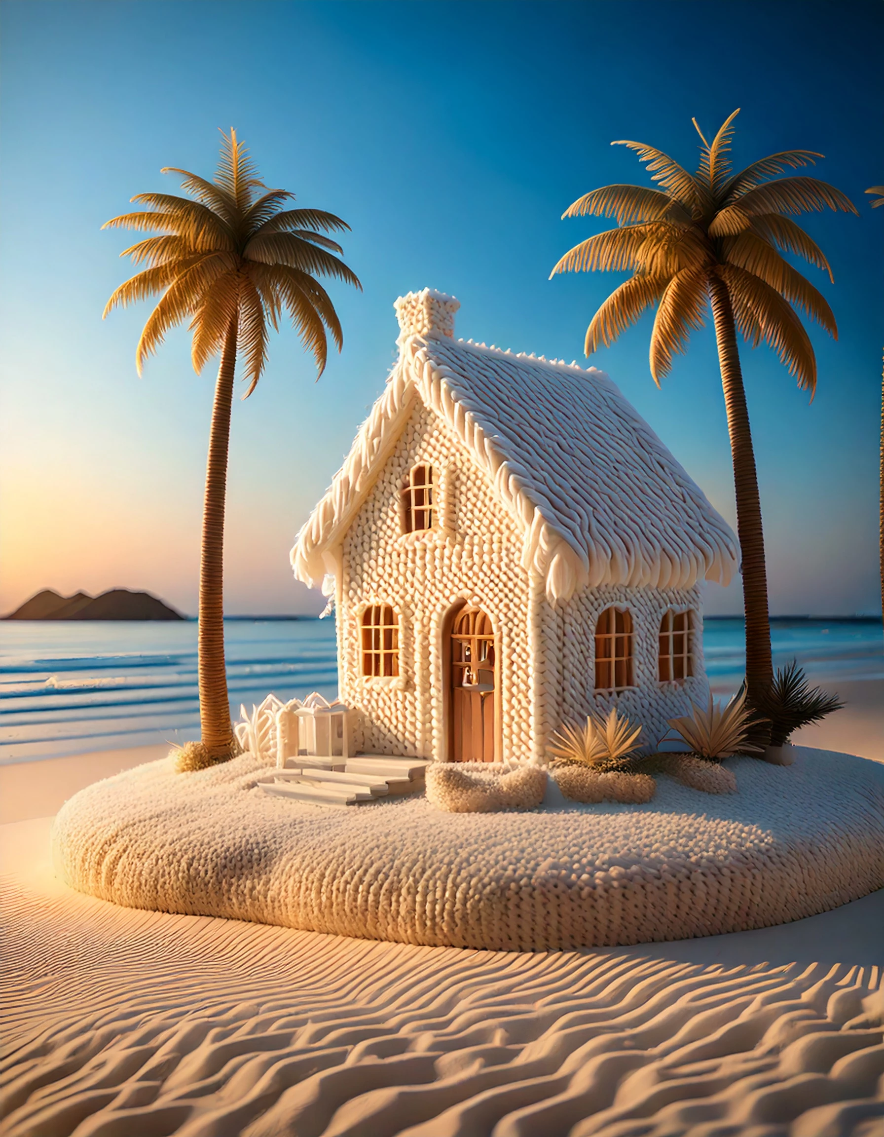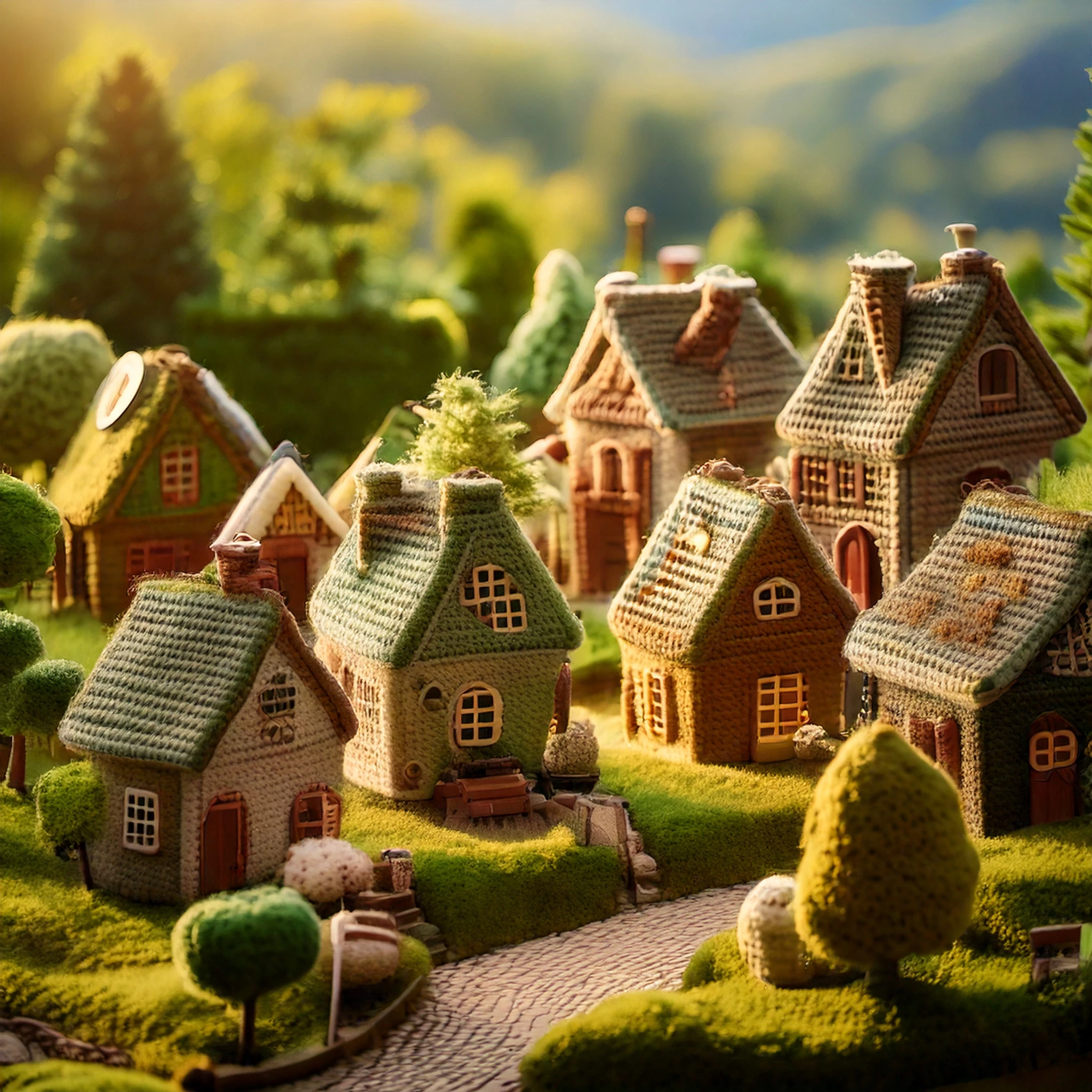 The Prompt I used: Design a cozy, small town crafted from soft, woolen textures. The charming buildings feature woolen rooftops and knitted walls, nestled in a serene, green landscape. Woolen trees line the streets, and giving the scene a warm sunlight, magical handmade atmosphere.