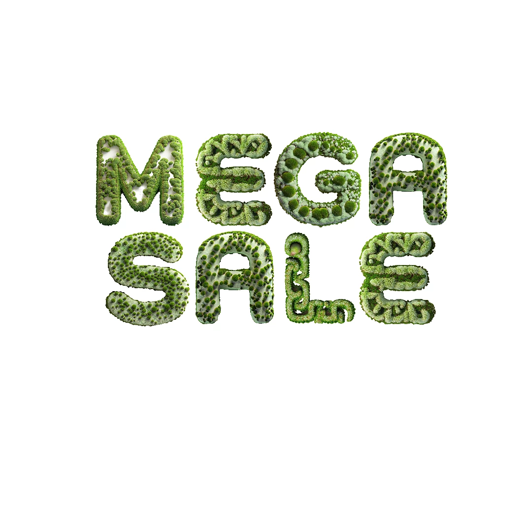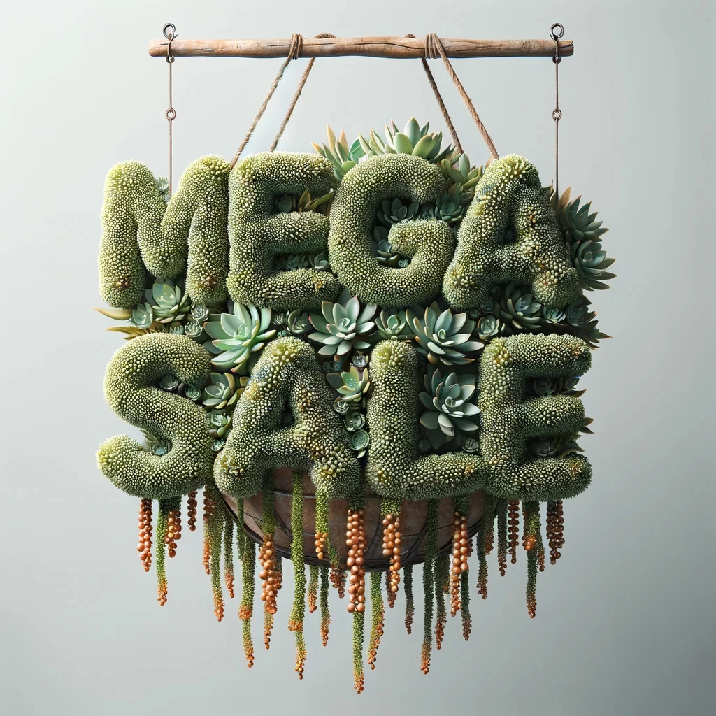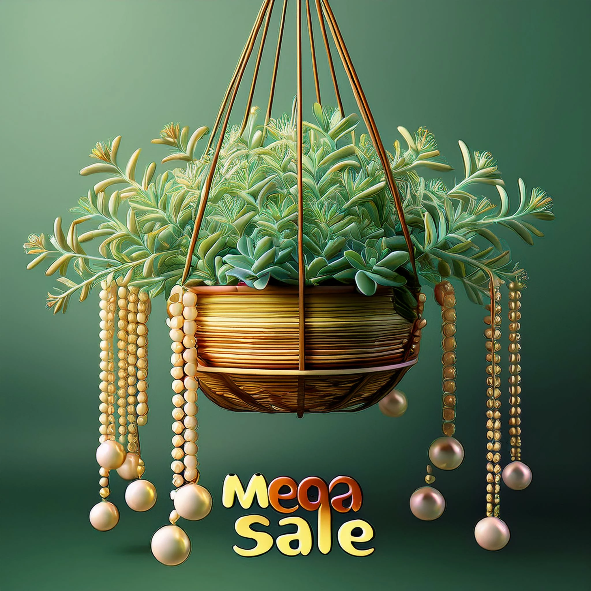 Design an artistic depiction of the phrase 'MEGA SALE' using the style of a Senecio Rowleyanus (String of Pearls) plant arranged in a hanging basket