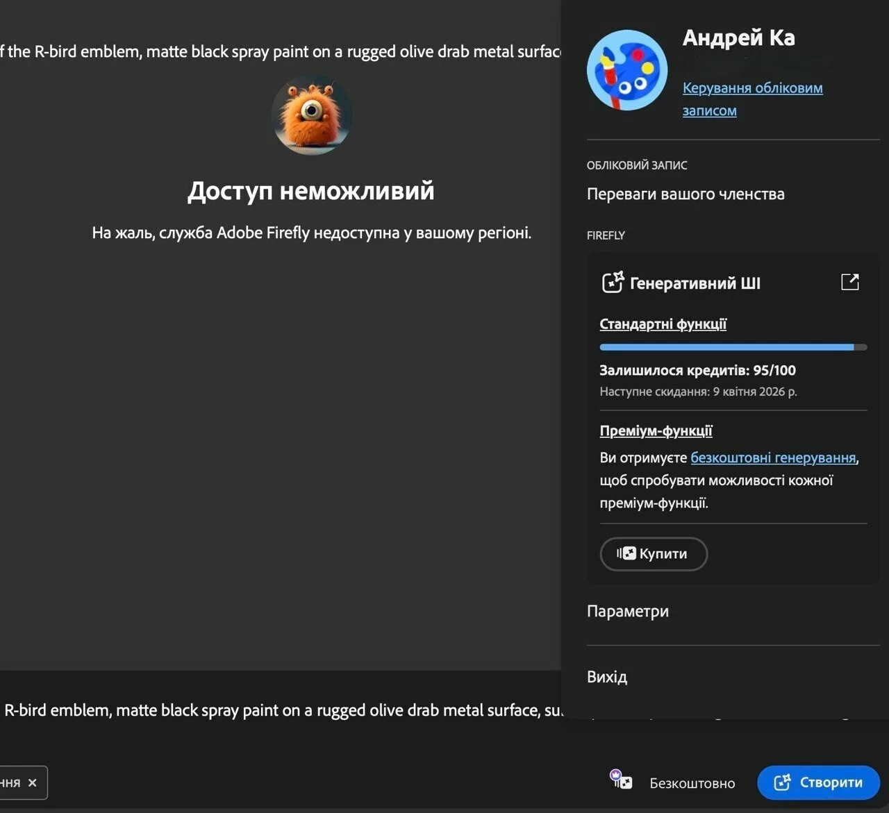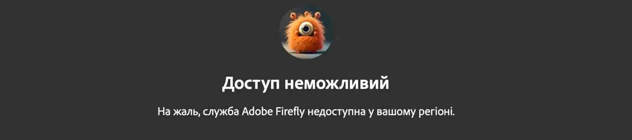 я сплачував протягом останніх місяців за генерацію Adobe Firefly останні тижні я отримую сповіщення про те що в моєму регіоні "Доступ неможливий На жаль, служба Adobe Firefly недоступна у вашому регіоні."
