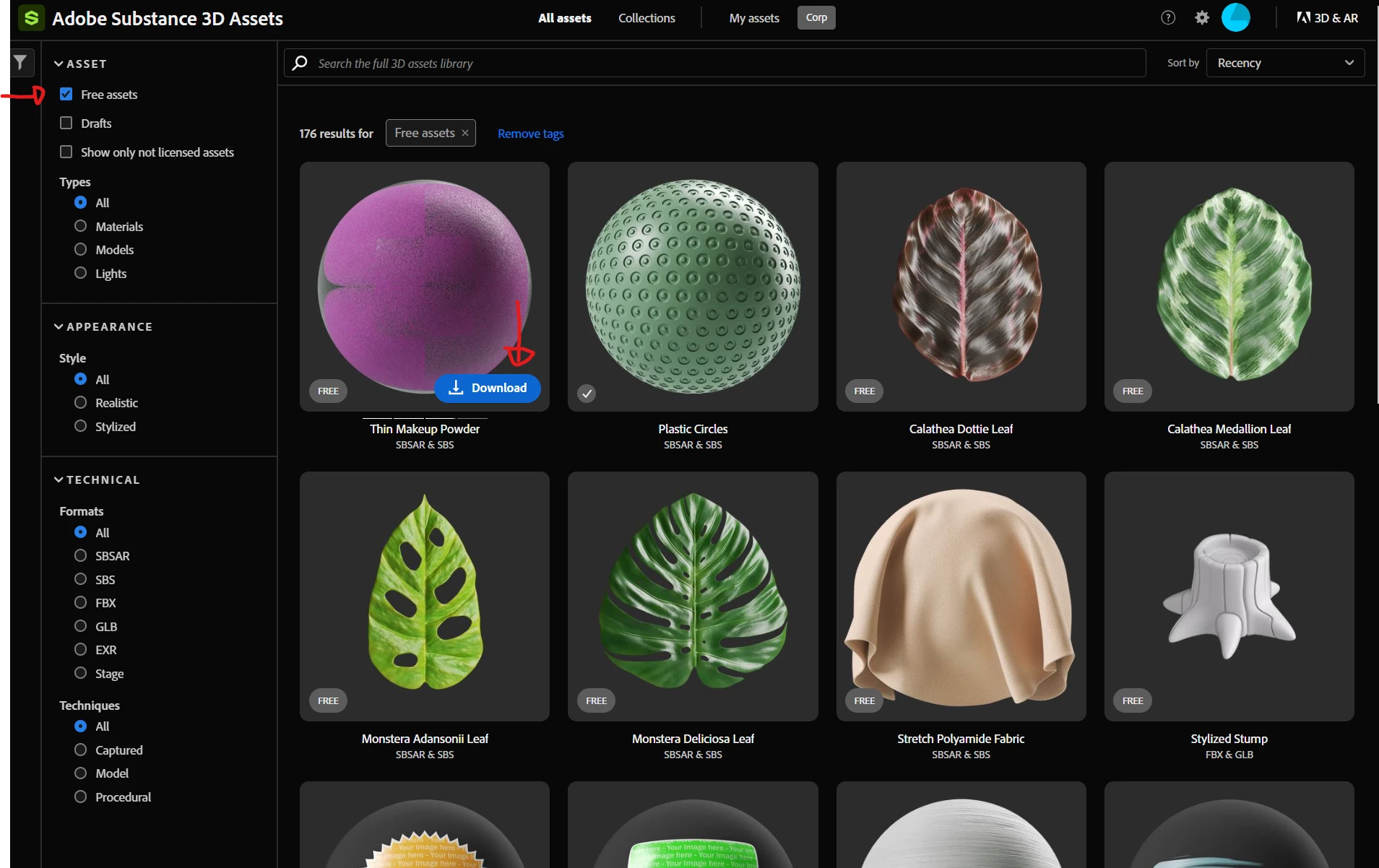 How do I download free/included with my Substance subscription 3D models/assets to my computer to be able to work with them?