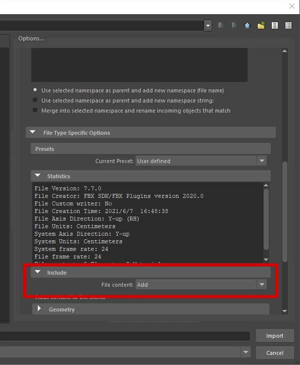 I use the adobe assets all the time and mostly they import into maya as normal but sometimes when I import an asset into Maya, the group is there but the actual geometry is missing or sometimes parts of the geometry is missing. Is this a problem with namespaces or the geometry themselves?
