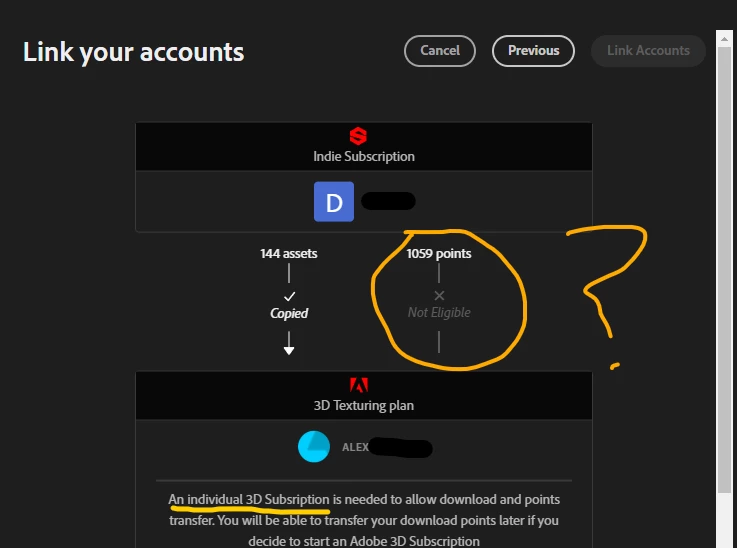 I bought a Substance 3D Texturing package on creative cloud. Now I want to transfer my points. But it won't transfer my points because it claims I don't have a 3D texturing package. This isn't true.