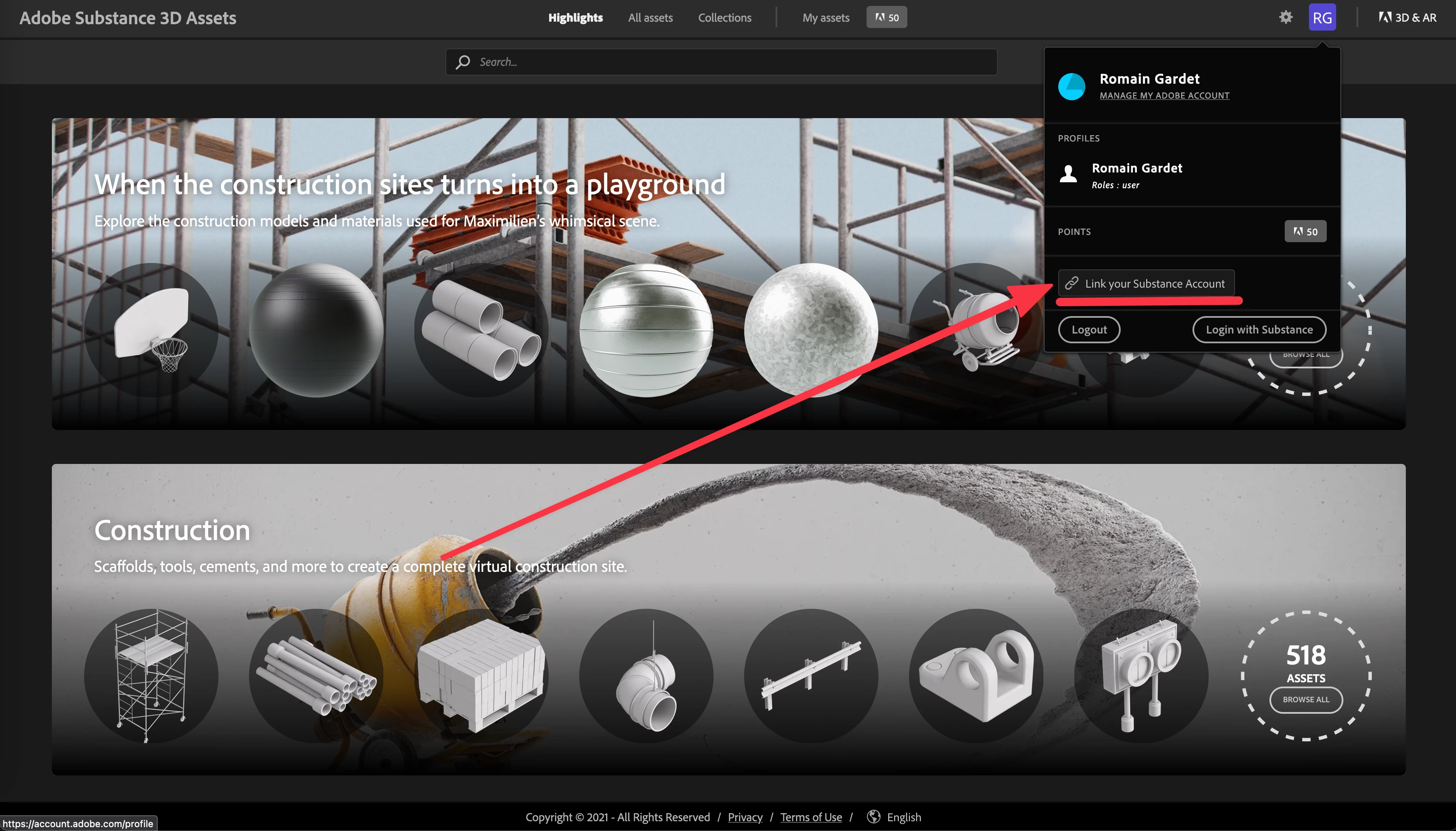 If you have/had a Substance account, please login with your substance account using your email ad password combination on the login page. Being logged in on adobe.com logs you automatically with your Adobe account on Substance 3D Assets, so try logging out and logging in again with your Substance account if you are logged in by default with your Adobe account.
