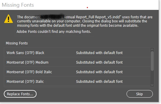 I have tried to download fonts into my Adobe products. Have activated them in CC and still I get this error message and pink highlighted text in a previous report that is being updated. Please help. I am not sure what to do and need to move forward with this document. I do NOT want substitued fonts.